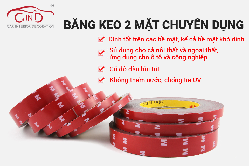 Băng keo 2 mặt chuyên dụng CIND (10mx10mm) sử dụng hữu hiệu cho xe hơi và trong nhà có tác dụng cố định các đồ vật hoặc liên kết các bề mặt với sự kết dính cao, hỗ trợ việc thay thế các mối hàn cũ mà không để lại các dấu vết hư hỏng trên bề mặt sử dụng.