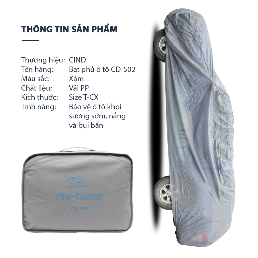 - Bạt phủ ô tô CIND CD-502 bán tải size TC-X 1 lớp PP được làm từ chất liệu vải PP chống bụi chính là một giải pháp hoàn hảo để bảo vệ xe bạn. Đường chỉ viền được may tỉ mỉ, đẹp mắt, bền bỉ lâu dài với thời gian. Đây chắc chắn sẽ là lựa chọn tuyệt vời nhất góp phần bảo vệ ngôi nhà di động của bạn an toàn hơn, và luôn giữ được vẻ sáng bóng của sơn.