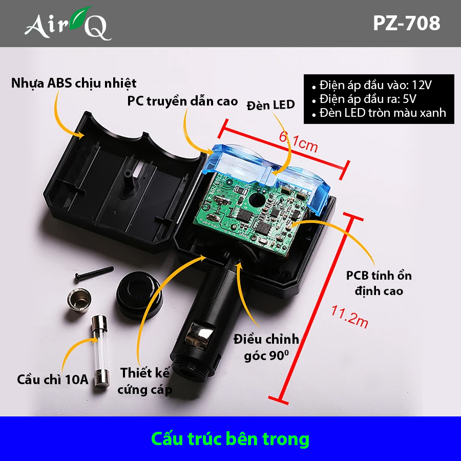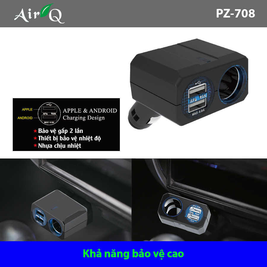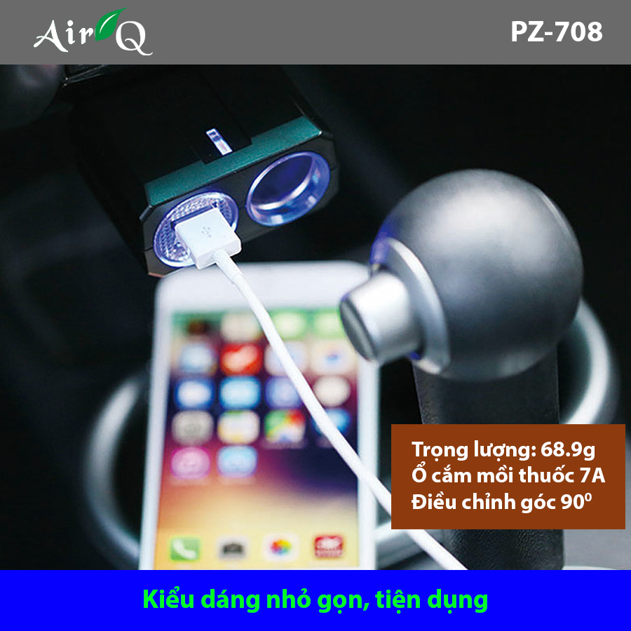 - Bộ chia tẩu ô tô 1 ổ và 2 cổng USB không dây AIR-Q PZ-708 với thiết kế sang trọng cứng cáp và tiện ích giúp chia tẩu ô tô trong xe thành hai ổ. Sản phẩm với lớp nhựa chịu nhiệt ABS và PCB ổn định giúp bạn an tâm trong quá trình sử dụng và truyền điện sang những thiết bị điển tử khác. Hệ thống đèn led và khả năng điều chỉnh góc lên đến 90 độ giúp sản phẩm phát huy tối ưu công dụng của mình trên những chặng đường dài.