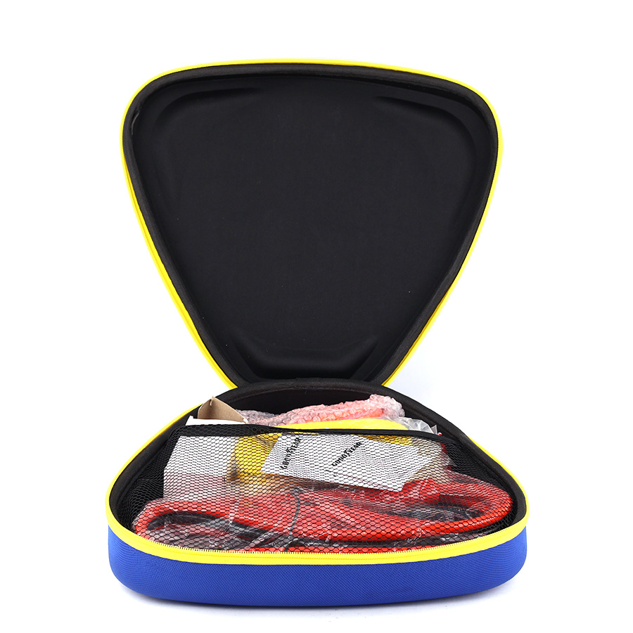 Dây kéo 4m hỗ trợ cứu hộ xe. Đèn pin 9 bóng LED và đèn tín hiệu giúp chiếu sáng và báo hiệu trong tình huống khẩn cấp. Búa thoát hiểm bằng thép không gỉ dùng để phá kính khi cần thoát hiểm. Găng tay chống trơn trượt đảm bảo an toàn khi sử dụng.
