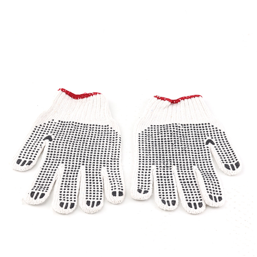 - Găng tay bằng 65% polyester + 35% cotton + sợi pha trộn màu trắng + PVC, vân chống trơn trượt, kích cỡ 230*130mm