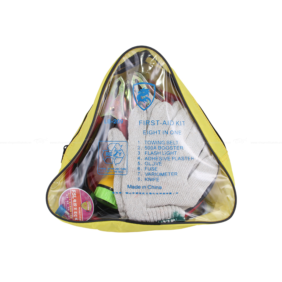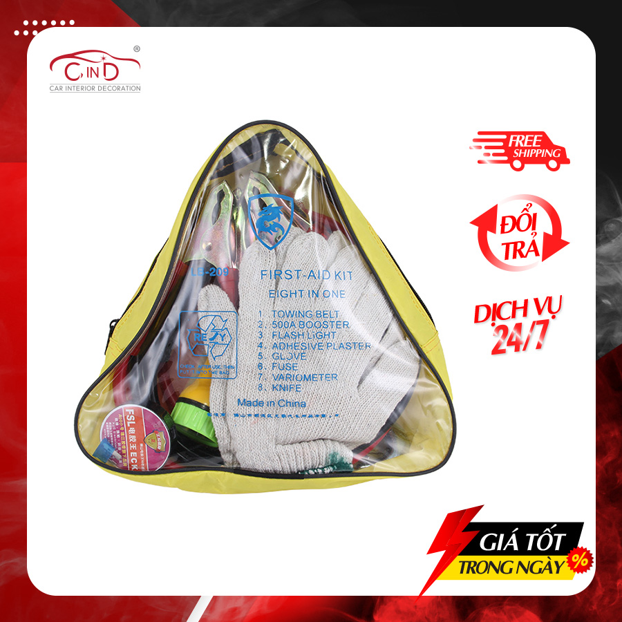 - Gồm 5 sản phẩm bên trong: dây sạt bình 500A, dây kéo xe, cầu chì, bao tay, đèn pin.