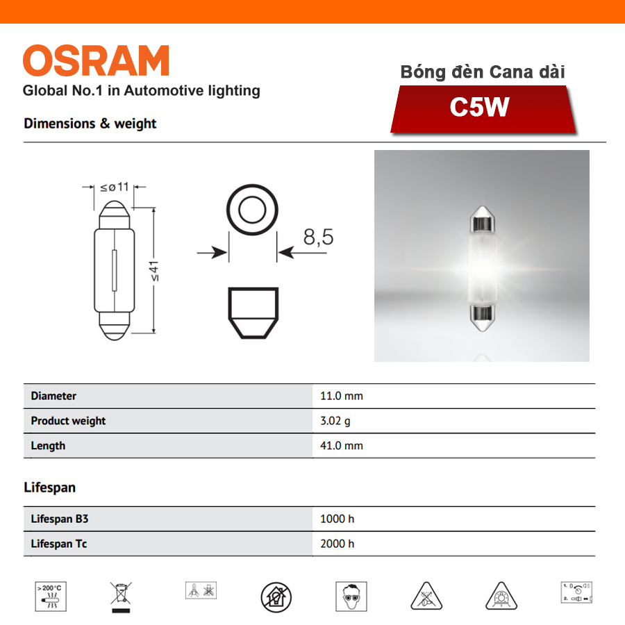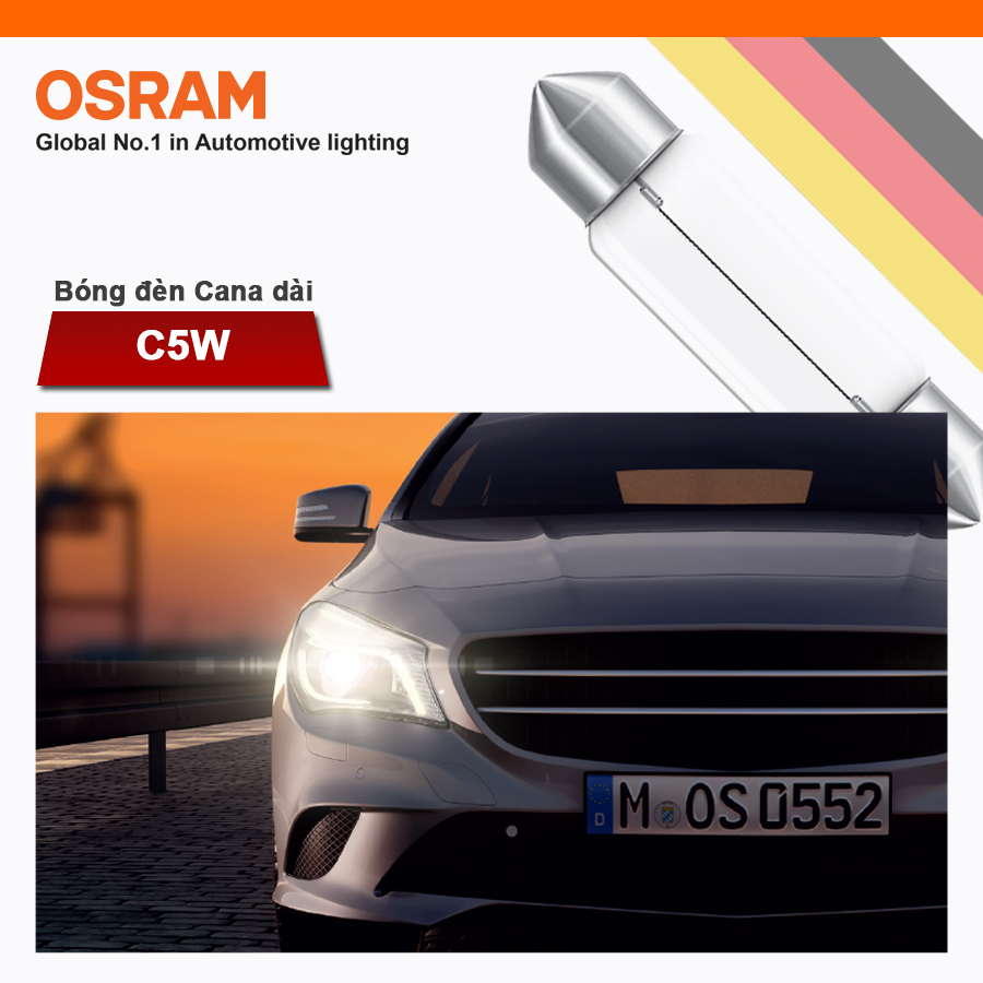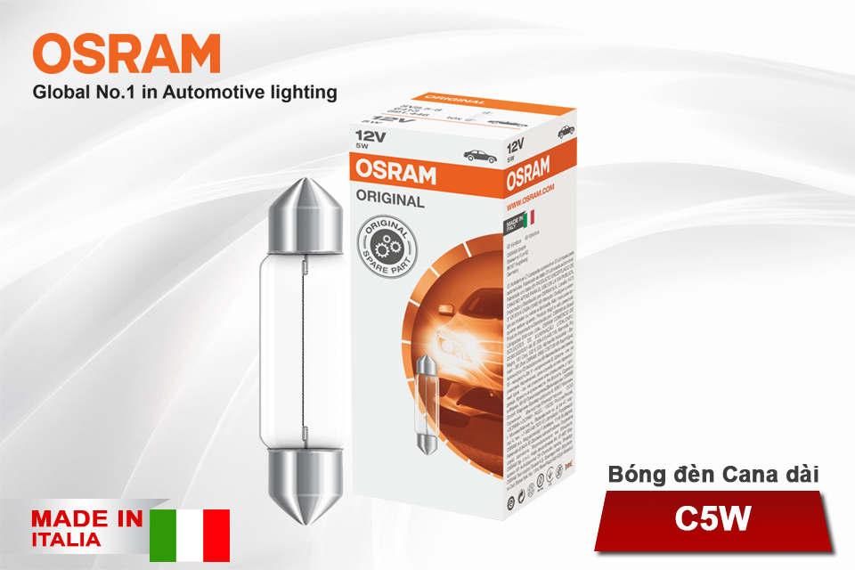 - Bóng đèn Cana dài OSRAM ORIGINAL C5W 12v 5w được chế tạo bằng thủy tinh cao cấp đạt tuổi thọ sử dụng cao giúp hỗ trợ chiếu sáng hiệu quả trên những chặng đường dài