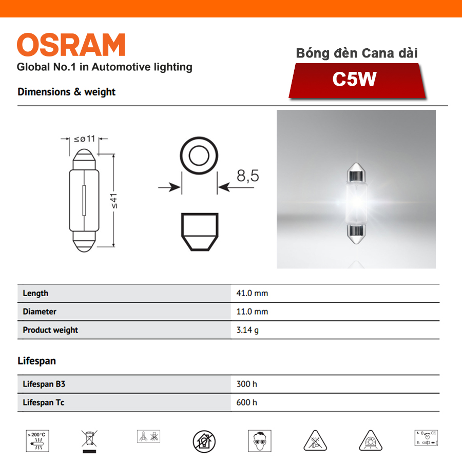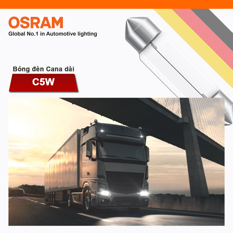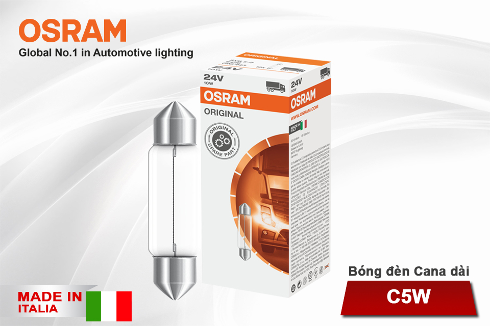 - Bóng đèn Cana dài OSRAM ORIGINAL C5W 24v 10w được chế tạo bằng thủy tinh cao cấp đạt tuổi thọ sử dụng cao giúp hỗ trợ chiếu sáng hiệu quả trên những chặng đường dài