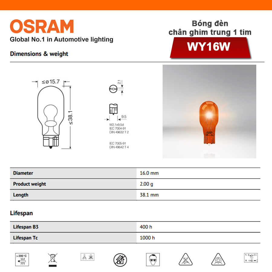 - Bóng đèn chân ghim trung 1 tim OSRAM ORIGINAL WY16W 12v 16w màu vàng được chế tạo bằng thủy tinh cao cấp, được sản xuất và kiểm tra bằng quy trình nghiêm ngặt nhất.
