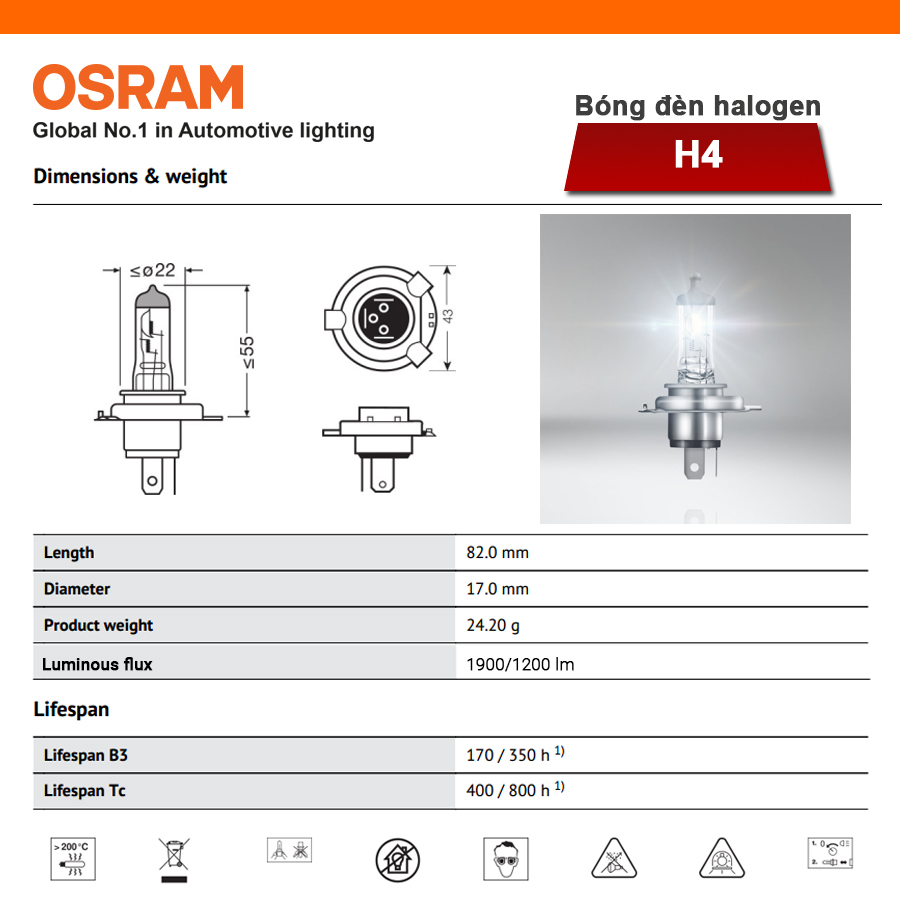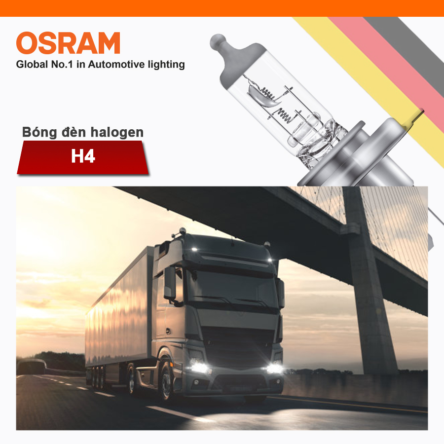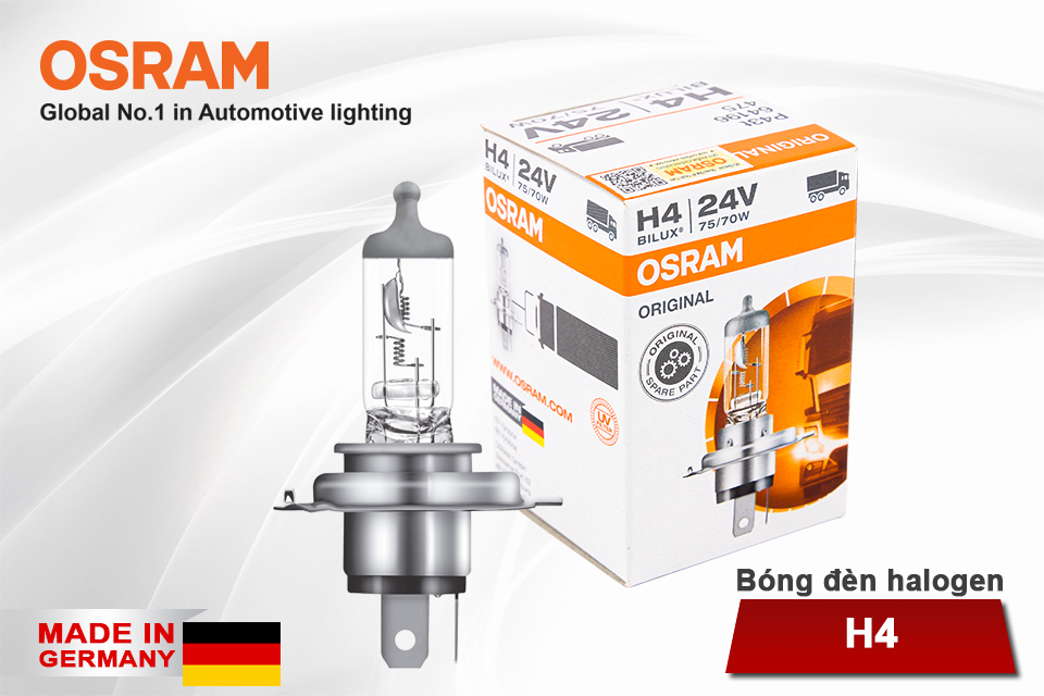 - Bóng đèn halogen OSRAM ORIGINAL H4 24v 75/70w được chế tạo bằng thủy tinh cao cấp đạt tuổi thọ sử dụng cao giúp hỗ trợ chiếu sáng hiệu quả trên những chặng đường dài