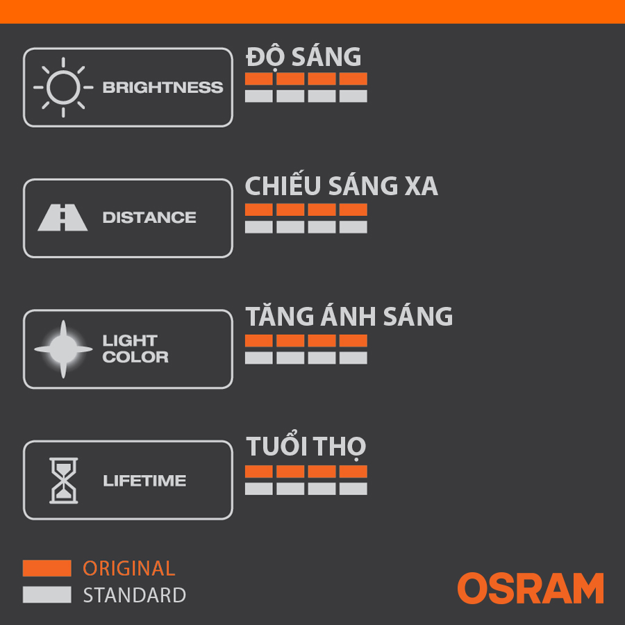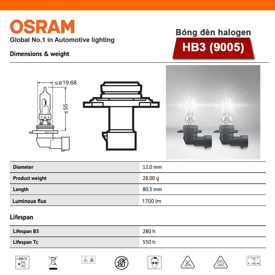 - Bóng đèn halogen OSRAM ORIGINAL HB3 12v 60w (chân cong) được chế tạo bằng thủy tinh cao cấp đạt tuổi thọ sử dụng cao giúp hỗ trợ chiếu sáng hiệu quả trên những chặng đường dài