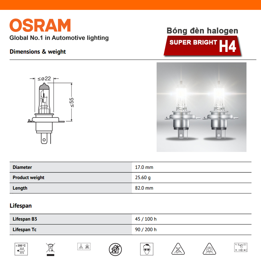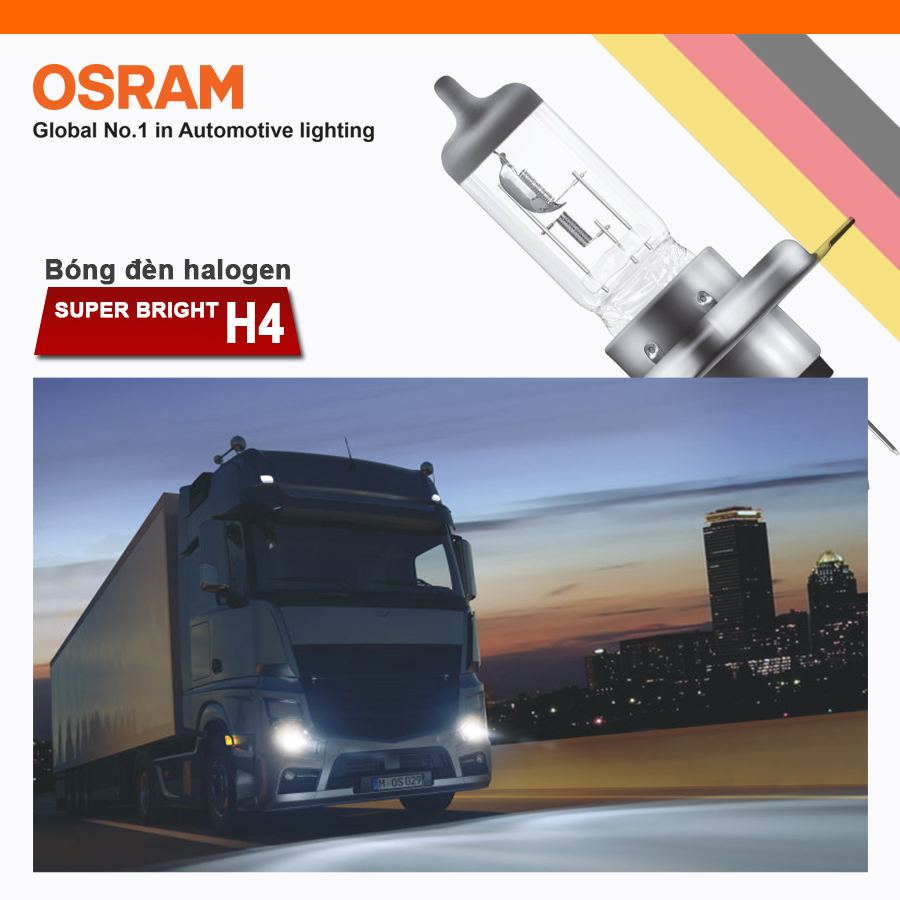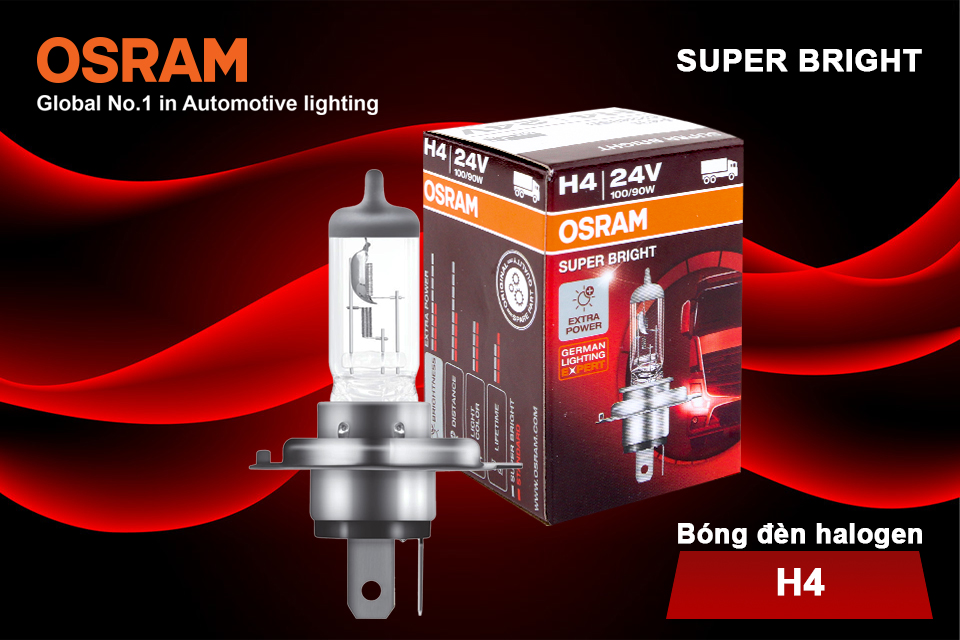 - Bóng đèn halogen OSRAM SUPER BRIGHT H4 24v 100/90w được chế tạo bằng thủy tinh cao cấp đạt tuổi thọ sử dụng phù hợp giúp hỗ trợ chiếu sáng hiệu quả trên những chặng đường dài