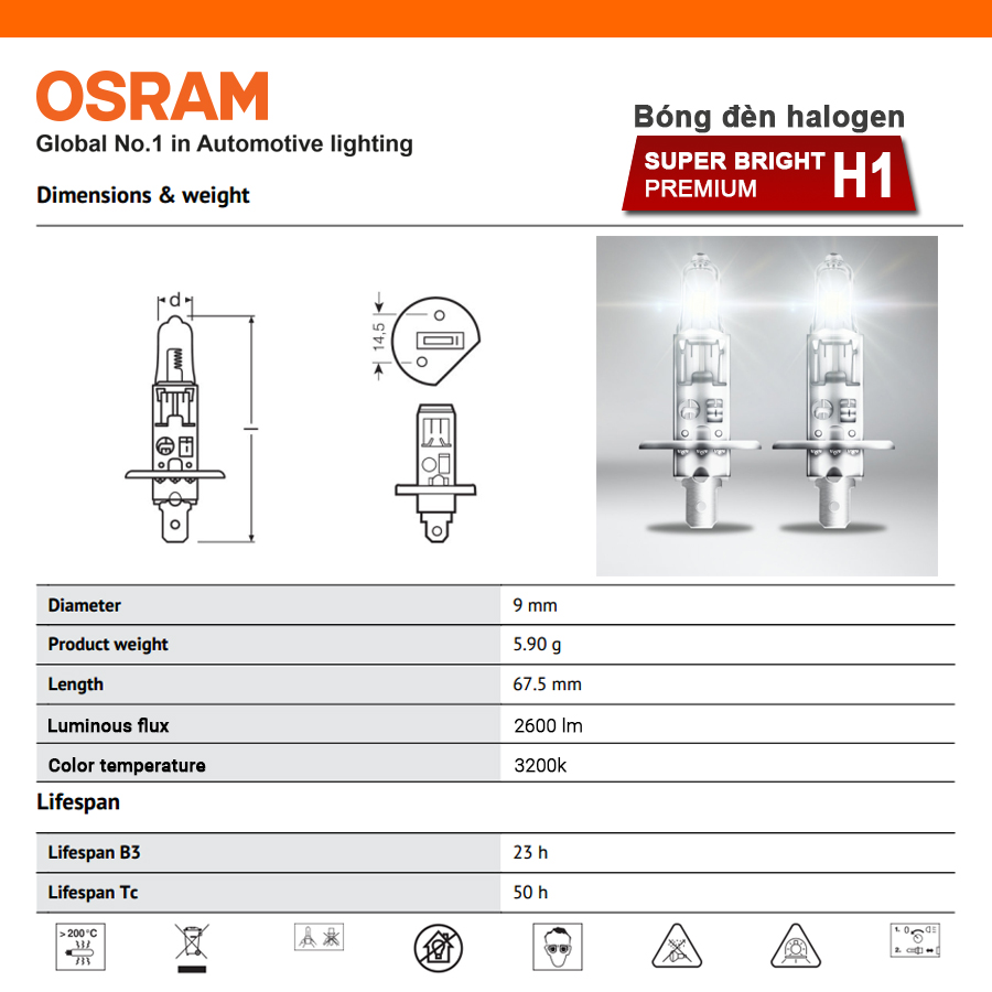 - Bóng đèn halogen OSRAM SUPER BRIGHT PREMIUM H1 12v 100w được chế tạo bằng thủy tinh cao cấp đạt tuổi thọ sử dụng phù hợp giúp hỗ trợ chiếu sáng hiệu quả trên những chặng đường dài