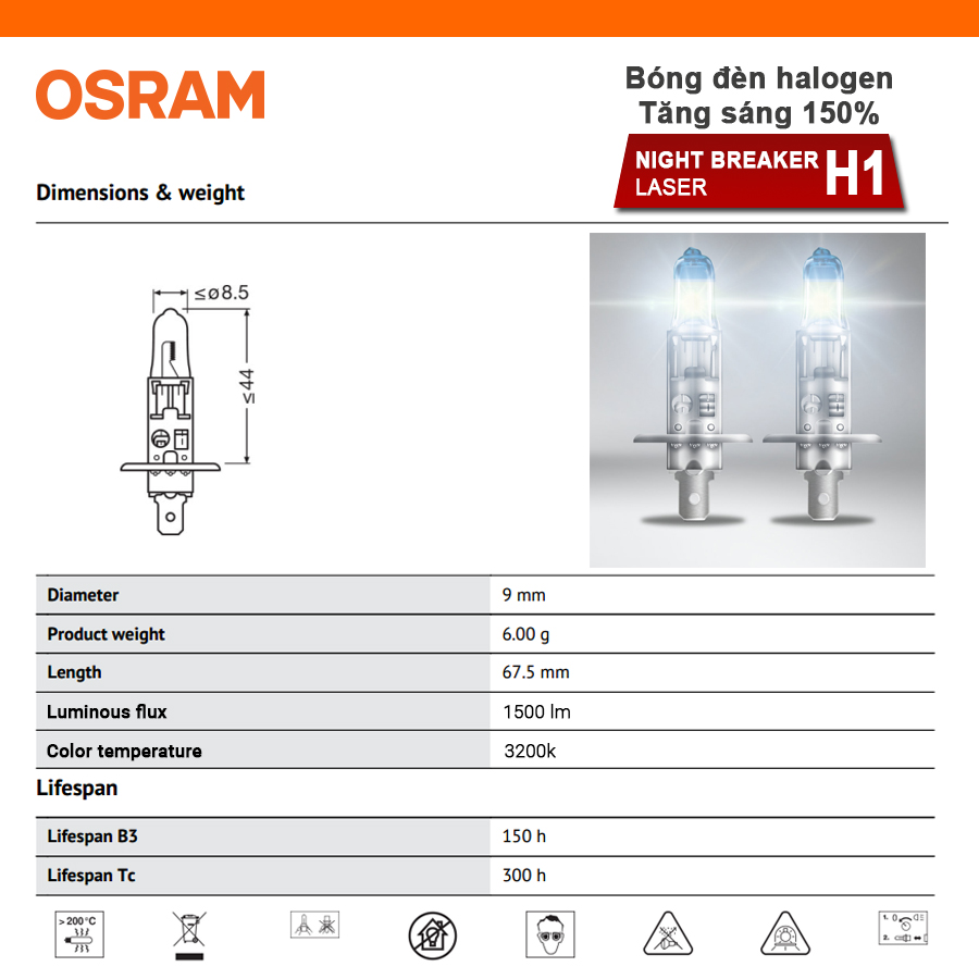 - Bóng đèn halogen tăng sáng 150% OSRAM NIGHT BREAKER LASER H1 12v 55w được chế tạo bằng thủy tinh cao cấp, được sản xuất và kiểm tra bằng quy trình nghiêm ngặt nhất.