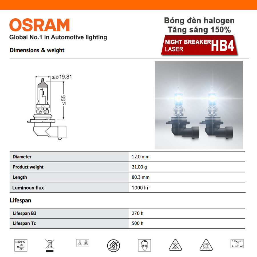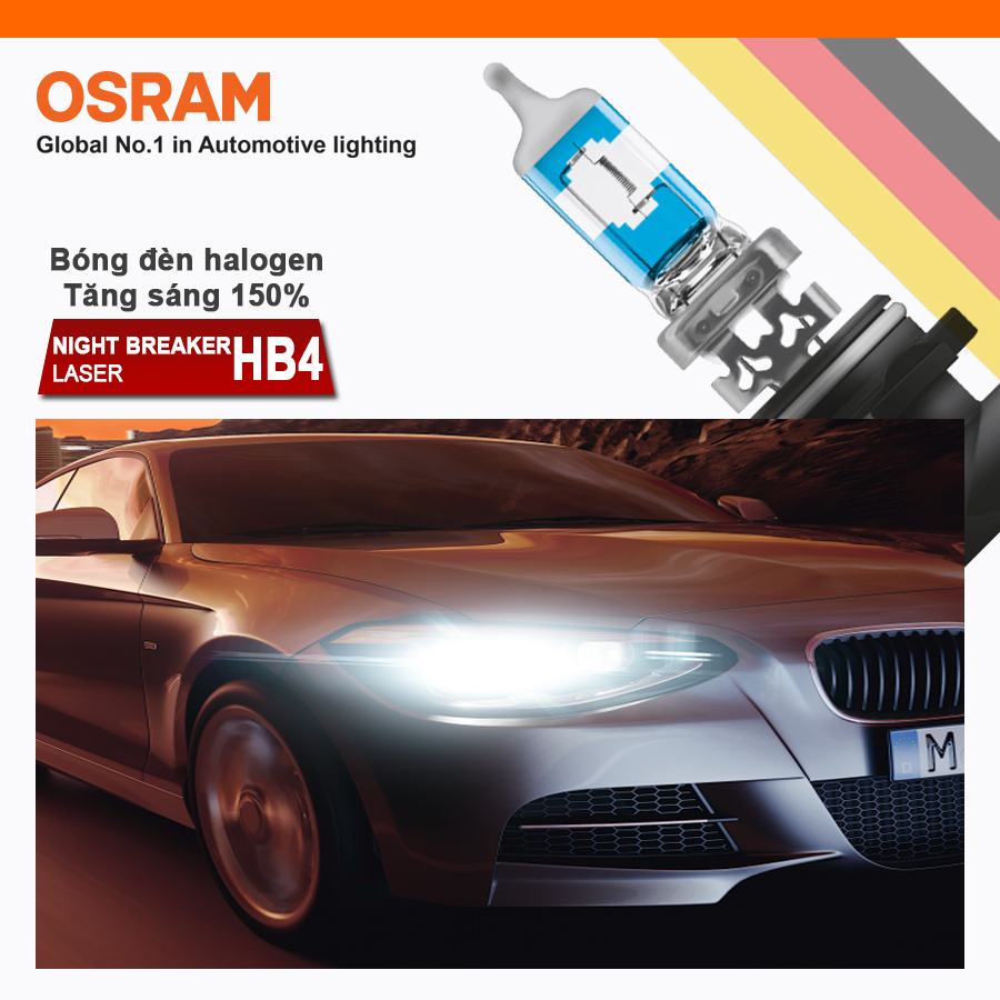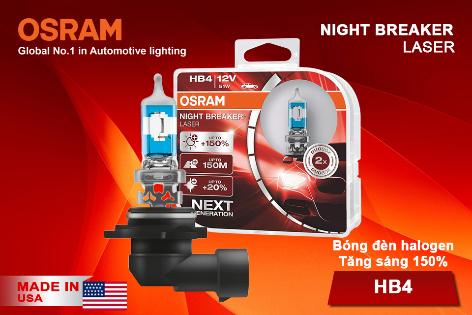 - Bóng đèn halogen tăng sáng 150% OSRAM NIGHT BREAKER LASER HB4 12v 51w được chế tạo bằng thủy tinh cao cấp, được sản xuất và kiểm tra bằng quy trình nghiêm ngặt nhất.
