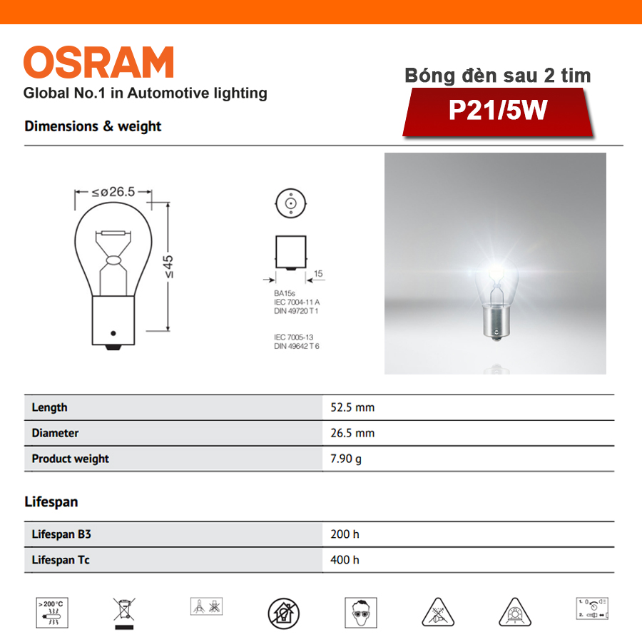 - Bóng đèn sau 2 tim OSRAM ORIGINAL P21/5W 24v 21/5w (chân cao thấp) được chế tạo bằng thủy tinh cao cấp, được sản xuất và kiểm tra bằng quy trình nghiêm ngặt nhất.