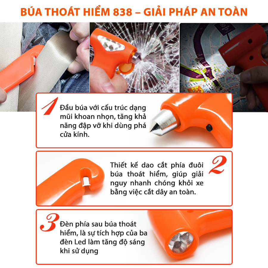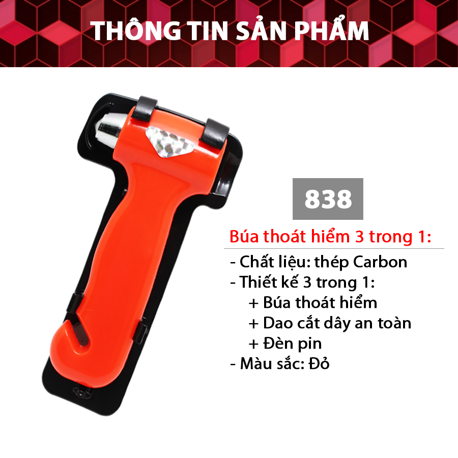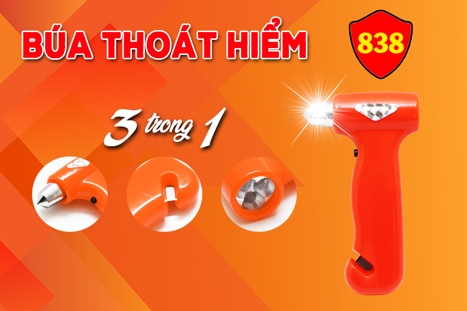 - Búa thoát hiểm 3 trong 1 838 là sự kết hợp tuyệt vời của ba tính năng thoát hiểm trong cùng một chiếc búa. Bạn không cần phải tốn quá nhiều không gian cho búa thoát hiểm hay mang theo quá nhiều vật dụng cứu hộ cho một chuyến đi chơi xa.