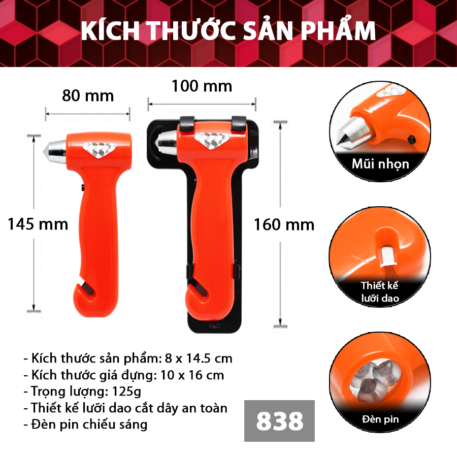 - Thiết kế dao cắt phía đuôi búa thoát hiểm 838 giúp giải nguy nhanh chóng bạn khỏi xe bằng việc cắt dây an toàn.