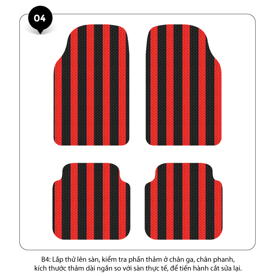 B4: Lắp thử lên sàn, kiểm tra phần thảm ở chân ga, chân phanh, kích thước thảm dài ngắn so với sàn thực tế, để tiến hành cắt sửa lại.