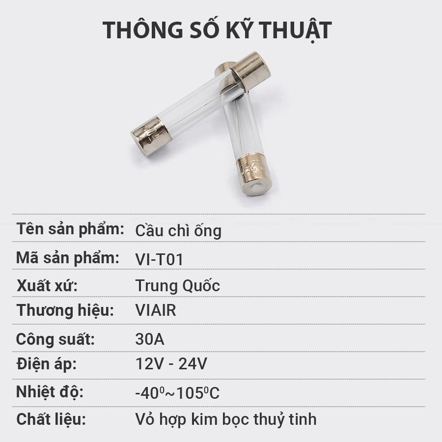 Cầu chì ống VIAIR VI-T01 30A được làm bằng dây chảy và chất liệu thuỷ tinh theo tiêu chuẩn và điện áp định mức, sử dụng phù hợp cho nhiều vị trí như ô tô, xe máy, nhà ở, các công trình hay sử dụng trong các mạch điện tử.