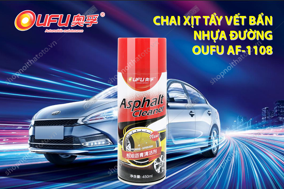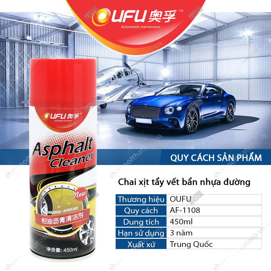 - Chai xịt tẩy vết bẩn nhựa đường OUFU AF-1108 450ml được nghiên cứu bởi các chuyên gia hàng đầu, có tác dụng tẩy sạch các vết nhựa đường cứng đầu bám trên bề mặt xe.