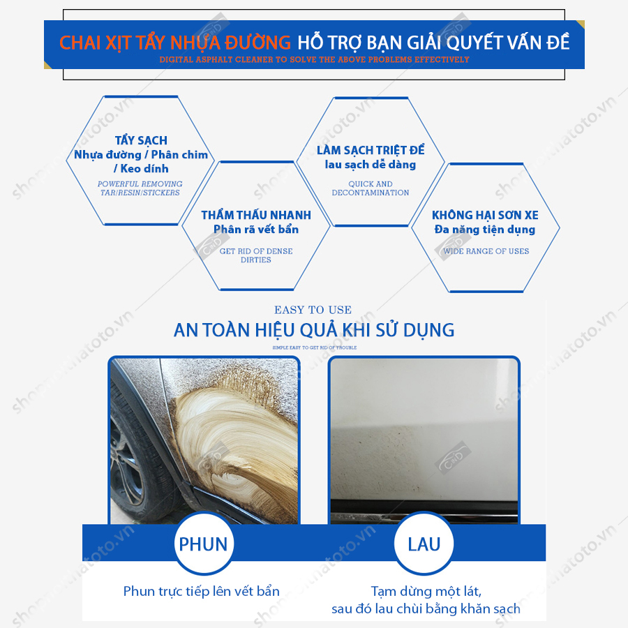 - Có một sản phẩm làm sạch nhựa đường một cách hiệu quả mà không làm hư tổn bề mặt xe.