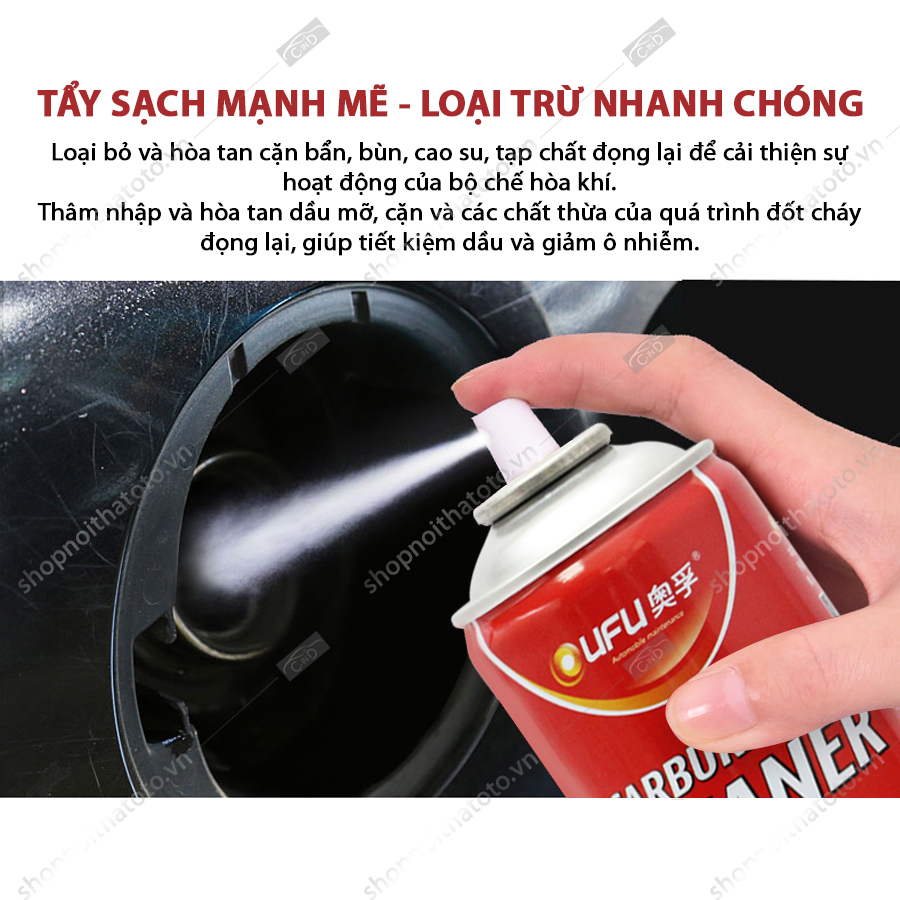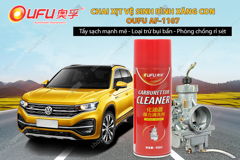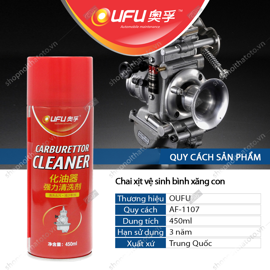 - Chai xịt vệ sinh bình xăng con OUFU AF-1107 450ml được chế tạo theo công nghệ hàng đầu có tác dụng tẩy sạch các vết bụi bẩn, dầu nhớt hay mỡ dư thừa trong bình xăng con.