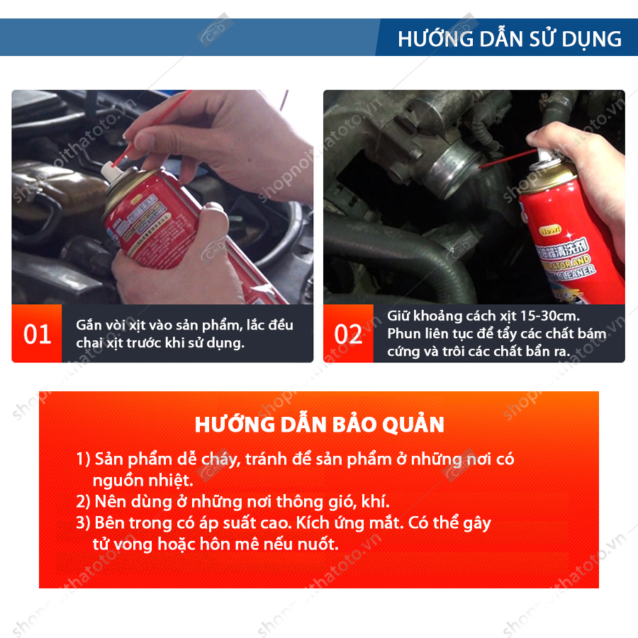 - Hướng dẫn sử dụng: Khởi động động cơ rồi để nguyên trong vòng 5-10 phút. Tháo bộ lọc khí trong khi máy vẫn chạy không, xịt sản phẩm vào bình xăng con, ngừng máy và lắp bộ lọc khí vào.