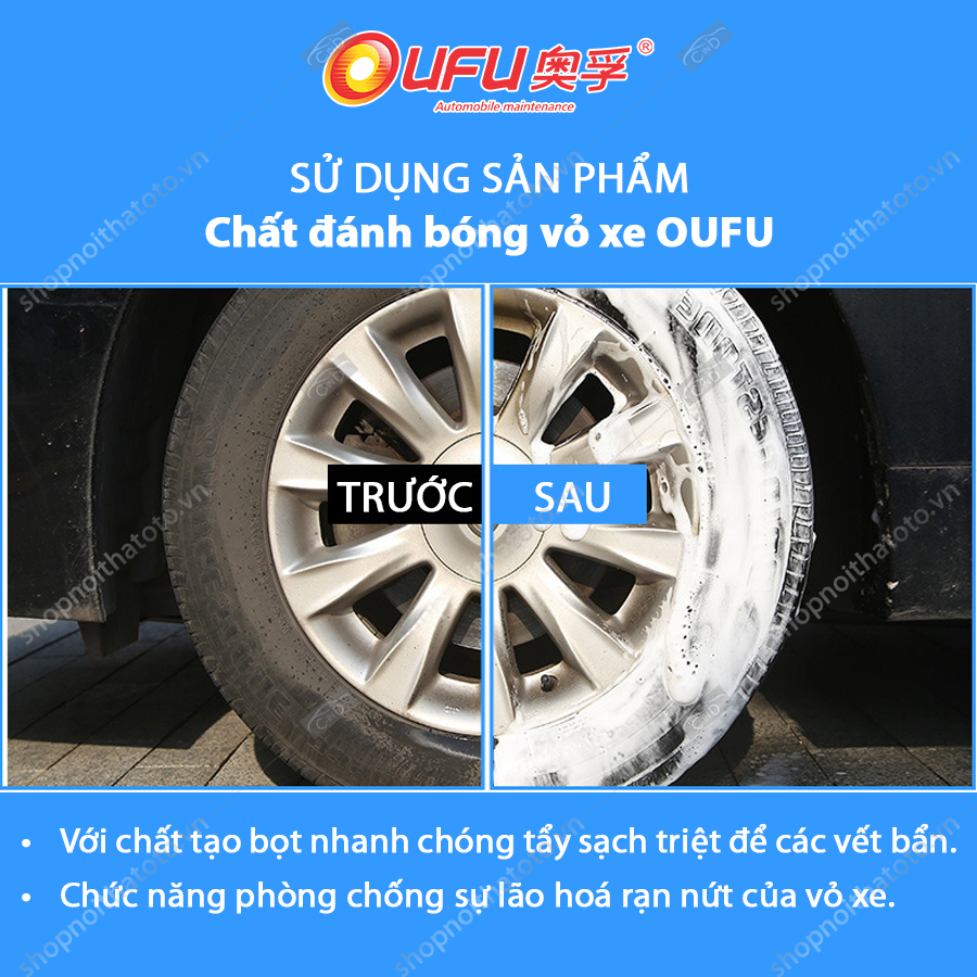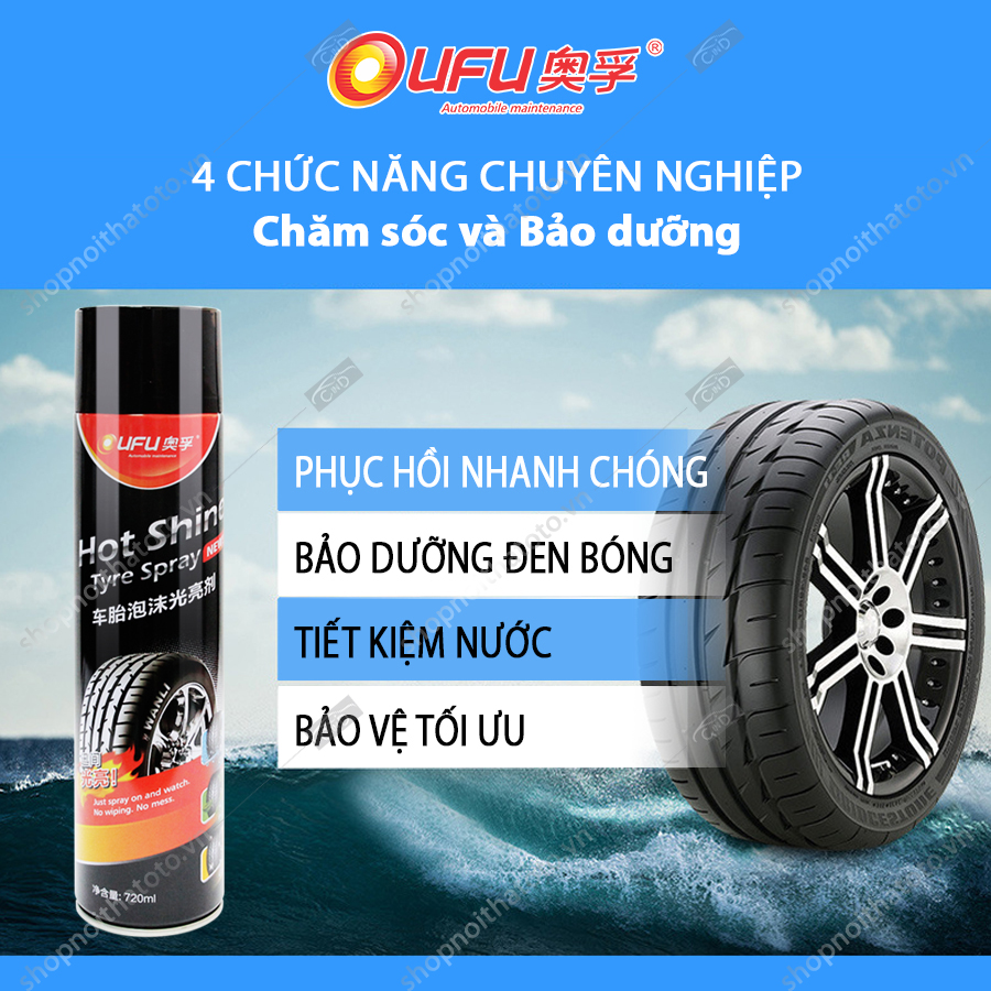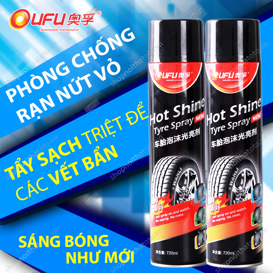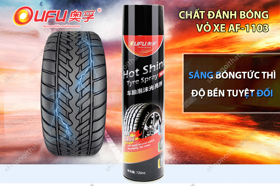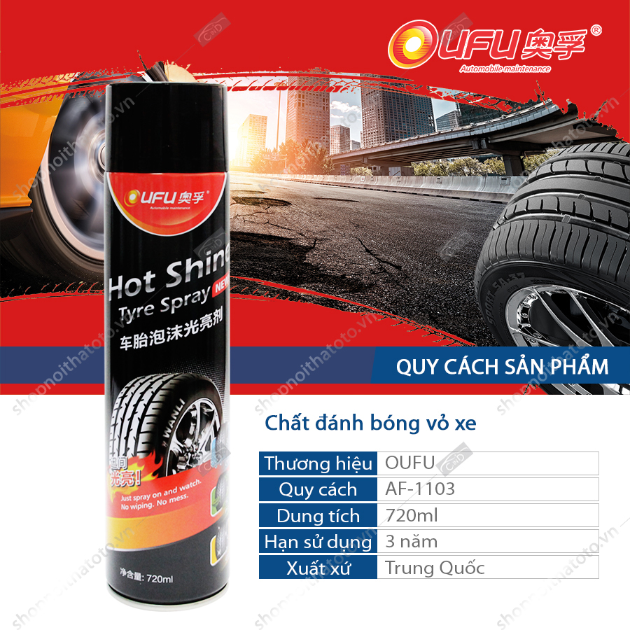 Chất đánh bóng vỏ xe OUFU AF-1103 720ml kết hợp tẩy sạch, đánh bóng, bảo vệ lớp vỏ từng bước chăm sóc vỏ (lốp) xe của bạn- với chất tạo bọt nhanh chóng tẩy sạch triệt để các vết bẩn, dầu nhớt trên bề mặt vỏ xe, thêm chức năng phòng chống sự lão hoá rạn nứt của vỏ xe. Sau khi sử dụng lớp vỏ sẽ trở nên đen bóng, sạch đẹp như mới.