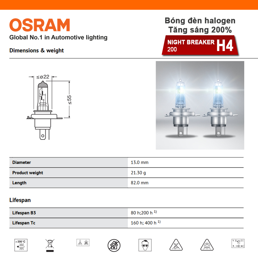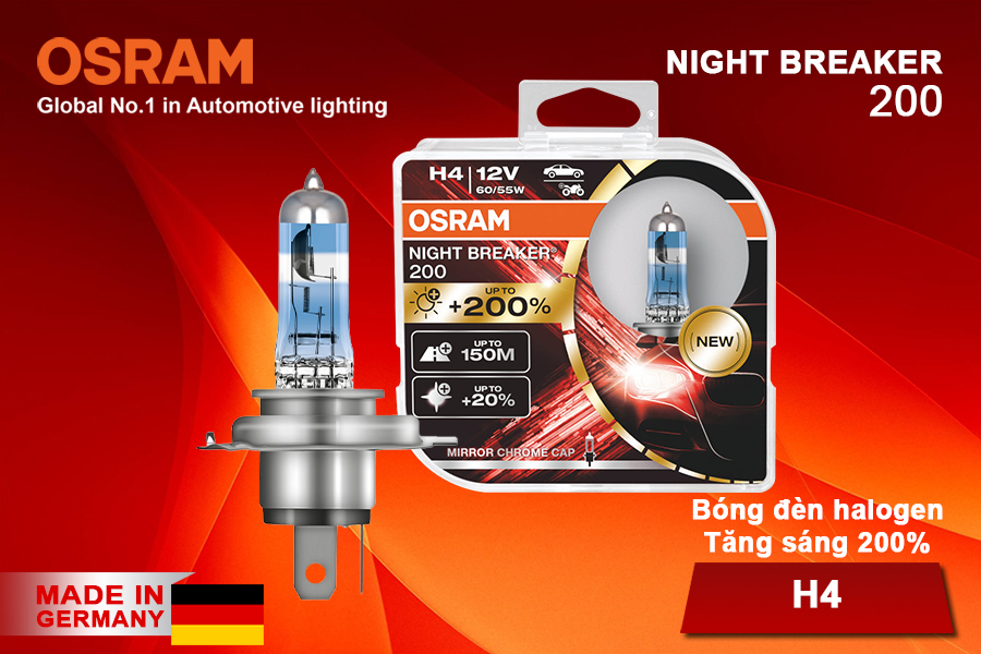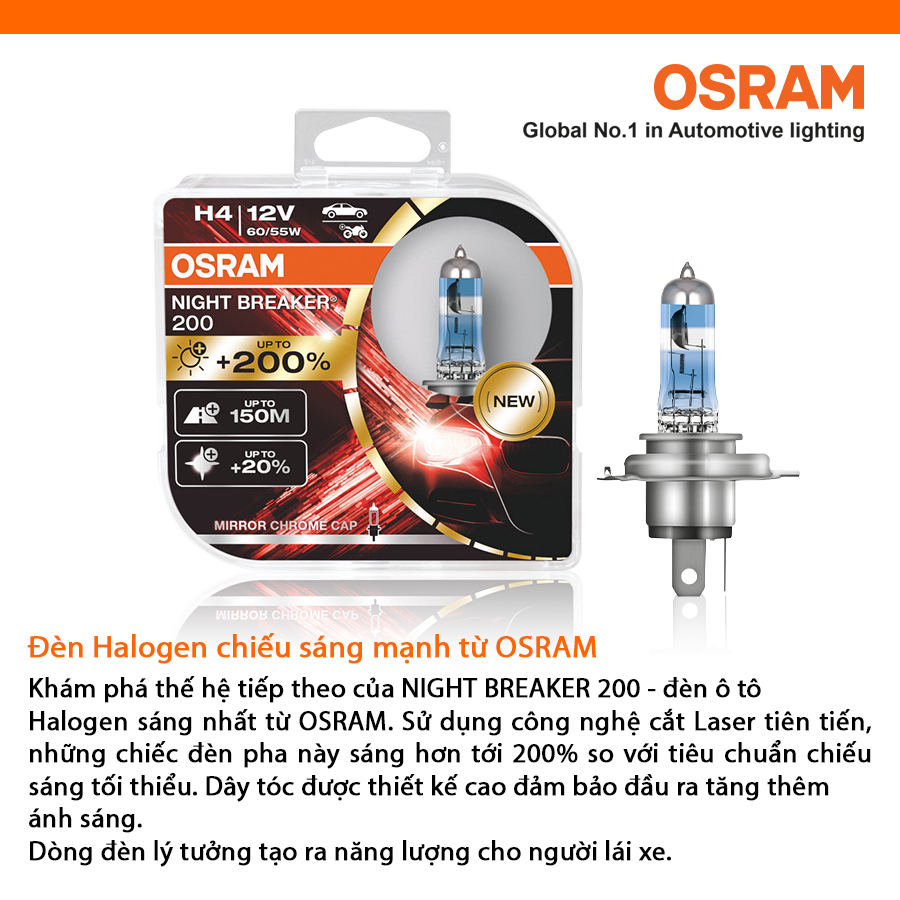 - Combo 2 Bóng Đèn Halogen Tăng Sáng 200% OSRAM Night Breaker H4 64193NB200 12V 60/55W được chế tạo bằng thủy tinh cao cấp, được sản xuất và kiểm tra bằng quy trình nghiêm ngặt nhất.