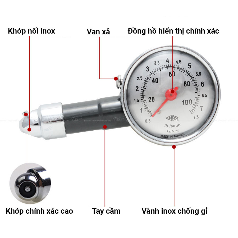 - Trang bị vòi xả giúp xả bớt độ căng của lốp kèm nút nhất hiện đại giúp đưa kim về vạch 0.