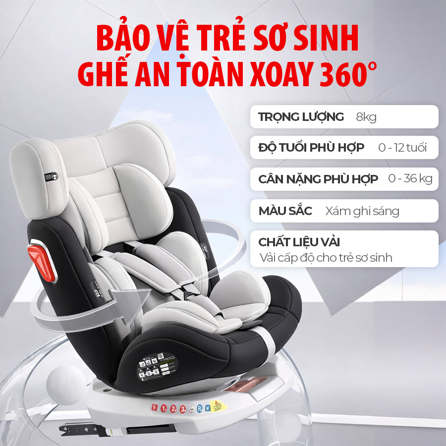 Ghế An Toàn Cho Trẻ Em QM-360A ISOFIX + Xoay 360° Thông Minh + Khoá An Toàn 5 Điểm Phiên Bản Hiện Đại Màu Xám Sang Trọng |
