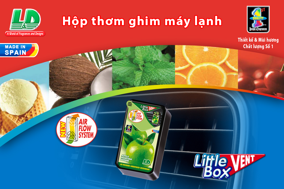 - Hộp thơm ghim máy lạnh L&D LITTLE BOX Green Apple được chế tạo bằng công thức đặc biệt với hương táo xanh tự nhiên, dịu nhẹ.