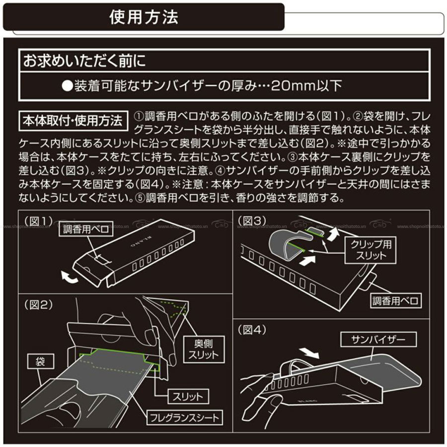 - Hướng dẫn sử dụng: Xem trên bao bì. Có thể điều chỉnh mùi hương nồng hay nhạt bằng cách kéo lưỡi điều chỉnh bên hông sản phẩm. Không kẹp thân vỏ chính vào phần che nắng và trần.
