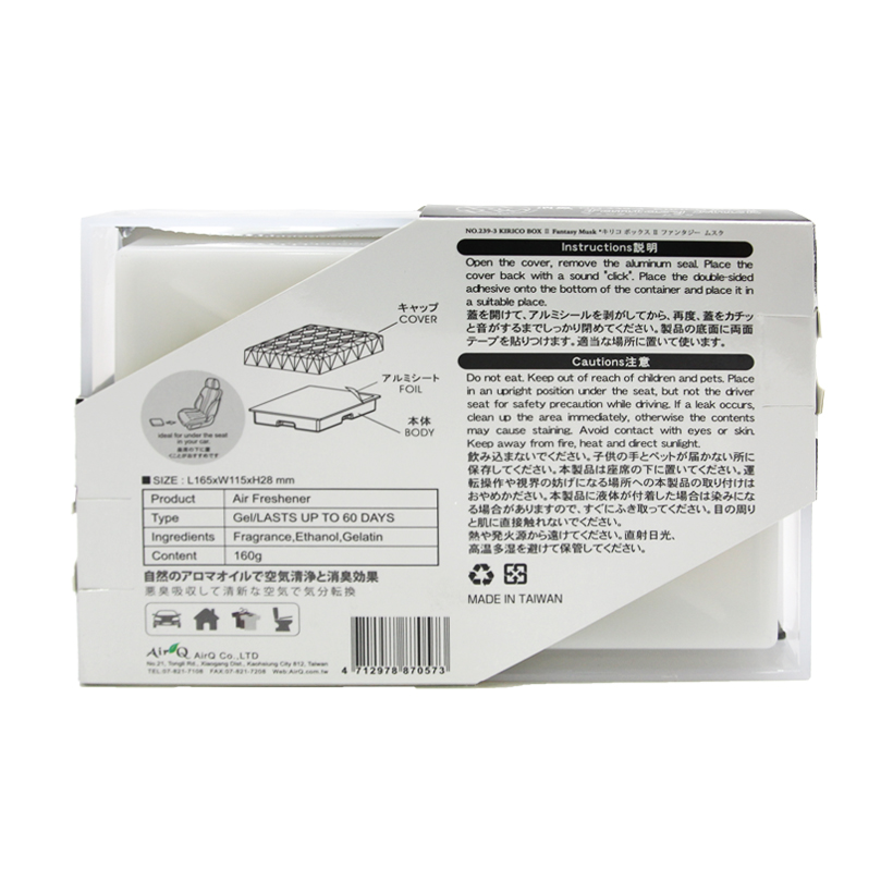 - Hộp thơm khử mùi AIR-Q KIRICO BOX II NO.239-3 Fantasy Musk 160g được chế tạo với công thức đặc biệt của các chuyên gia hàng đầu tại Đài Loan, với hương xạ nhẹ nhàng giúp bạn thư giãn thoải mái, tăng khả năng tập trung khi tham gia giao thông. Thiết kế nhiều mặt cắt dạng kim cương vừa hỗ trợ lan toả mùi hương tốt hơn vừa tạo nét chấm phá nổi bật trong không gian