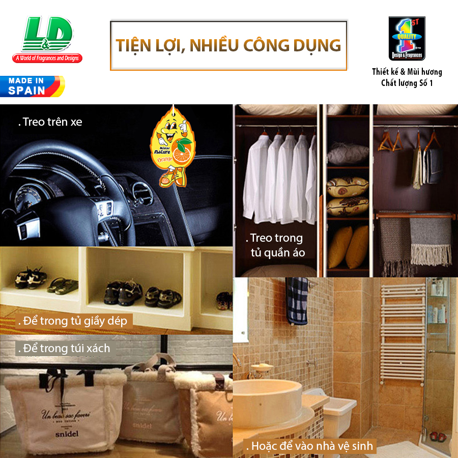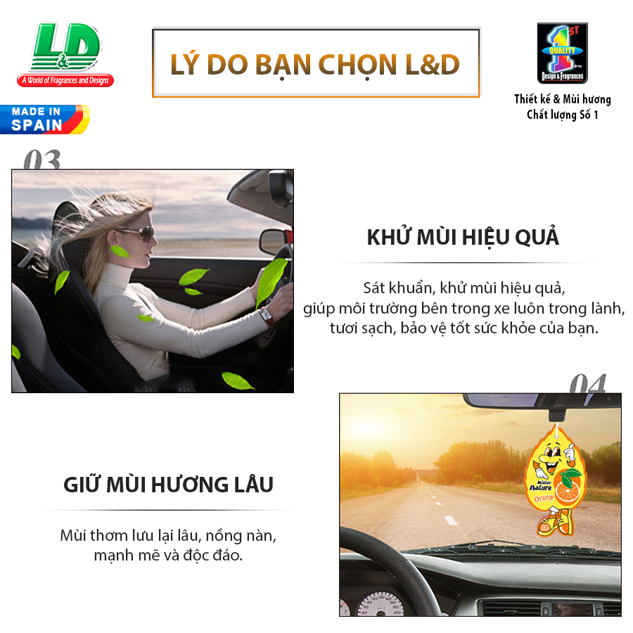 - Lá thơm nụ cười may mắn L&D MISTER NATURE Orange với các thành phần thiên nhiên giúp mang lại hương thơm nhẹ nhàng, tạo cảm giác thoải mái cho người ngồi trong xe. Hơn thế nữa, sản phẩm còn có tác dụng khử sạch mùi hôi, mang lại bầu không khí thoáng mát và sạch sẽ trong chiếc xe của bạn. Sản phẩm thương hiệu khử mùi số 1 châu Âu, xuất xứ từ Tây Ban Nha , không tạo mùi quá gắt trong thời tiết nắng nóng nên bạn có thể yên tâm khi sử dụng.