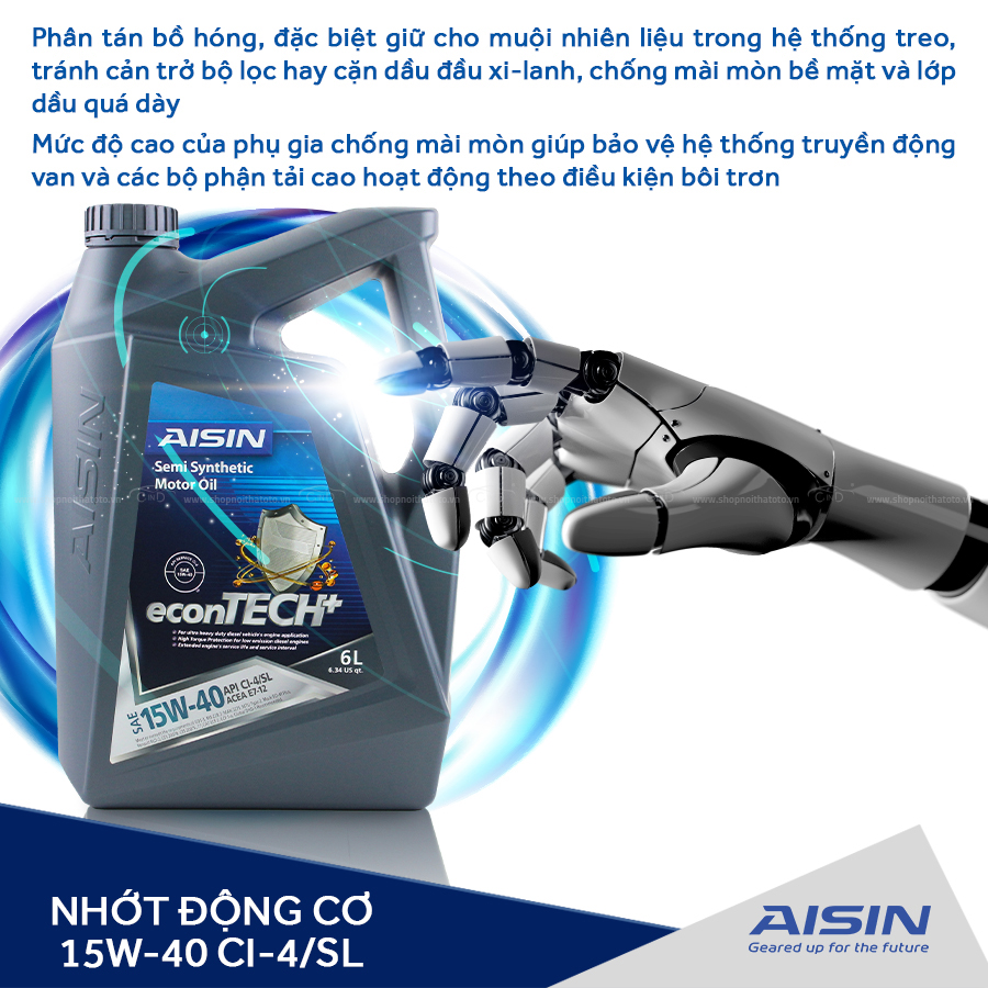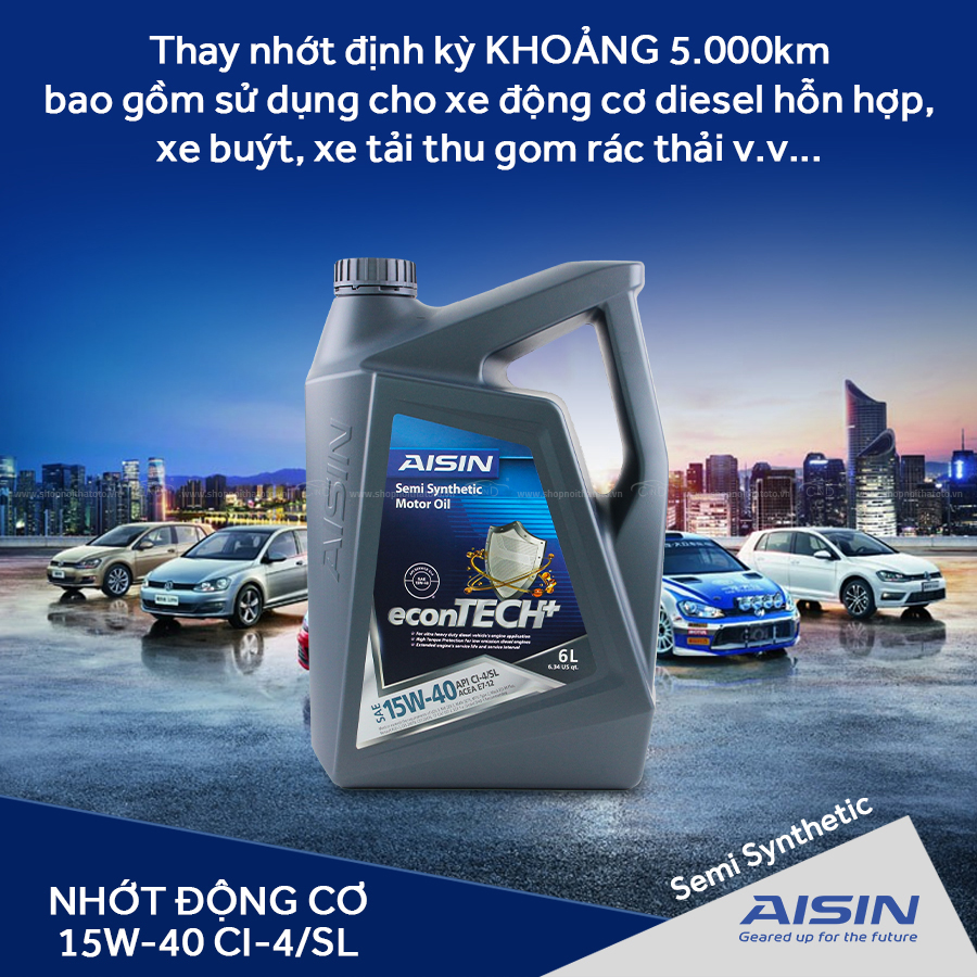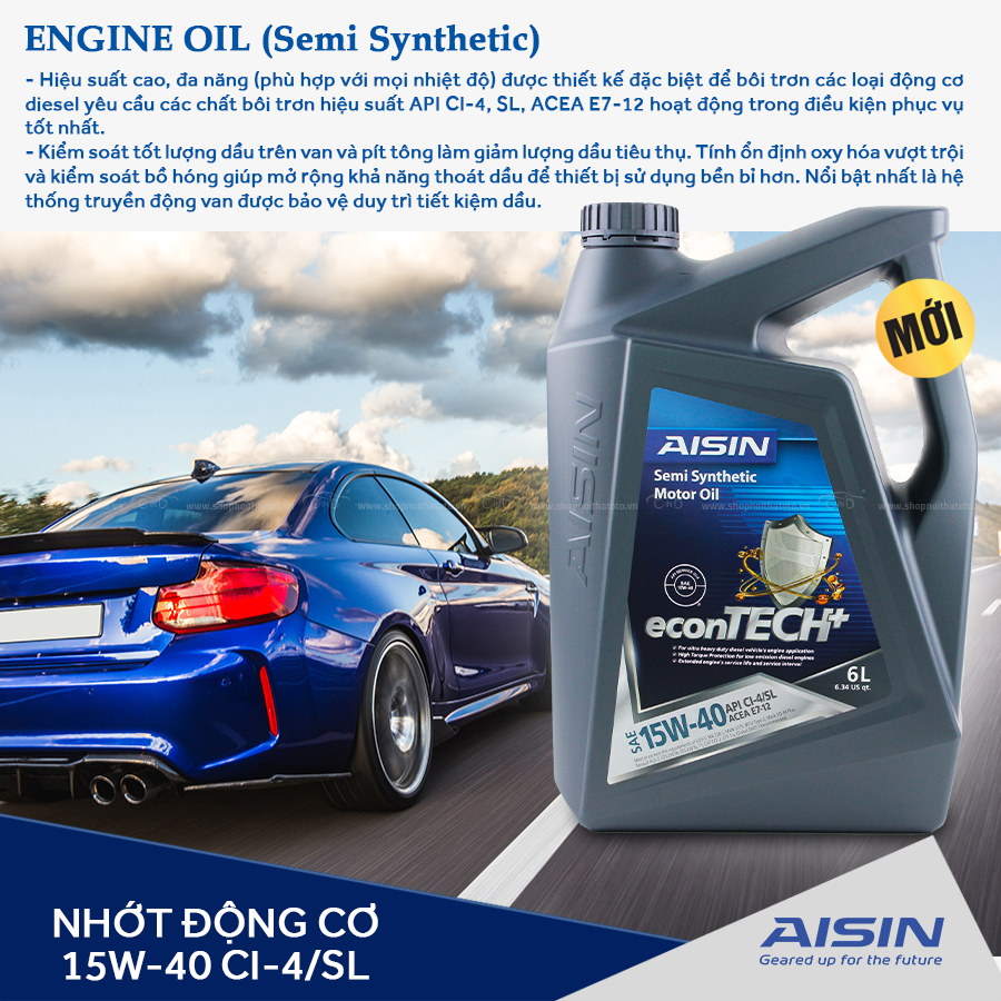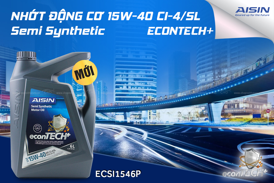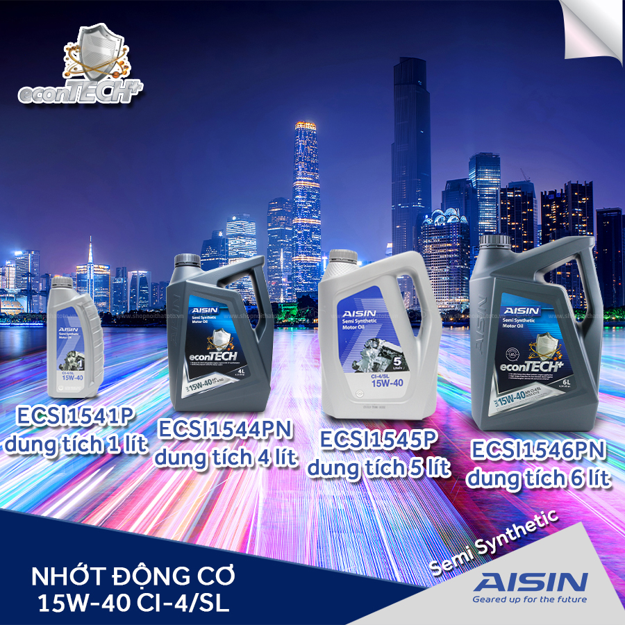 - Nhớt động cơ AISIN ECSI1546P 15W-40 CI4 / SL econTECH+ Semi Synthetic 6L là dầu nhớt bán tổng hợp chất lượng cao với công thức pha chế từ dầu gốc hệ thống phụ gia đạt hiệu suất cao và chỉ số nhớt đứng hàng đầu theo tiêu chuẩn API SN.