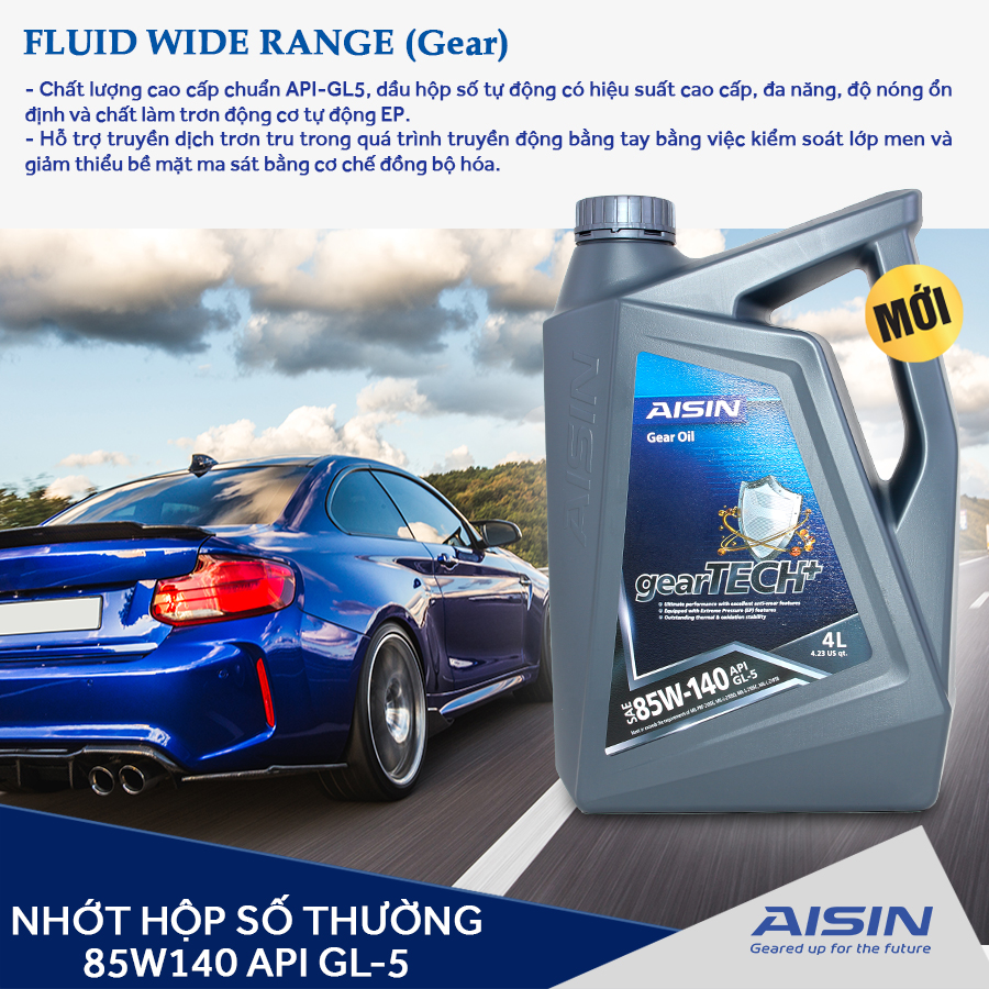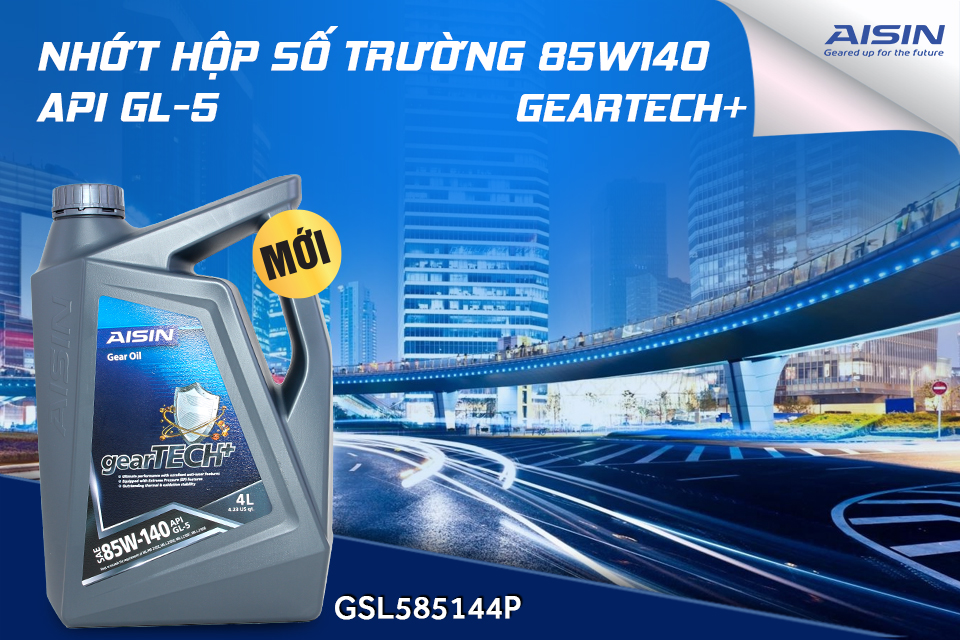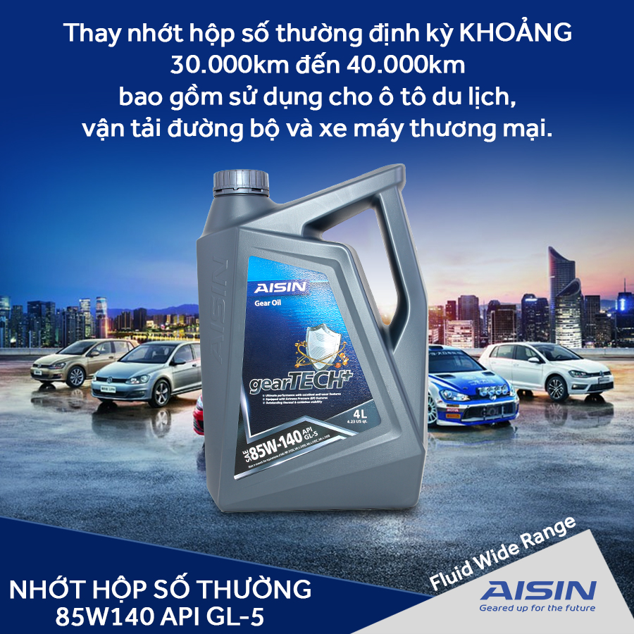 - Nhớt hộp số thường AISIN GSL585144P 85W-140 GL-5 gearTECH+ Gear Oil 4L là dầu bôi trơn hộp số theo tiêu chuẩn API GL-5, MIL-PRF-20105E, MIL-L21050D, MIL-L-2150B, có khả năng duy trì nhiệt độ hộp số ổn định và kết hợp áp suất cao giúp tăng hiệu suất đồng thời cải thiện hoạt động bôi trơn được tốt hơn, hợp cho các dòng xe sử dụng hộp số thường.