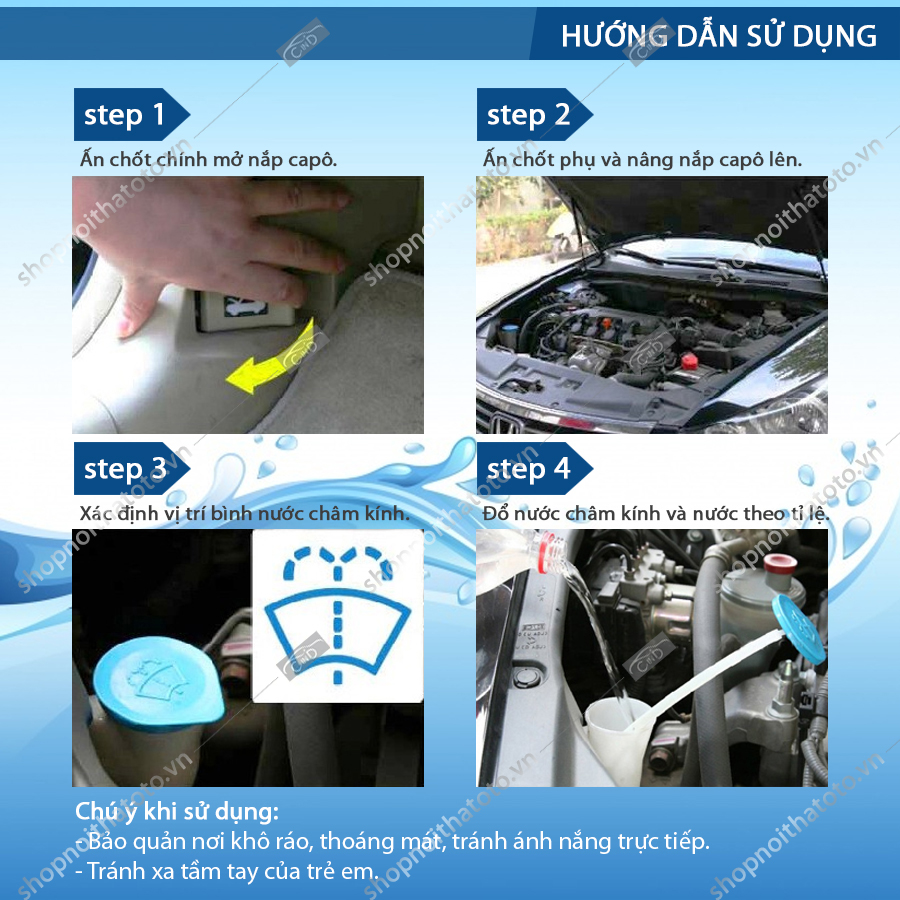 - Đổ vào bình chứa nước châm kiếng nằm phía trước xe, trong khoang động cơ (nên chọn loại nước sạch để đạt hiệu quả tốt nhất).