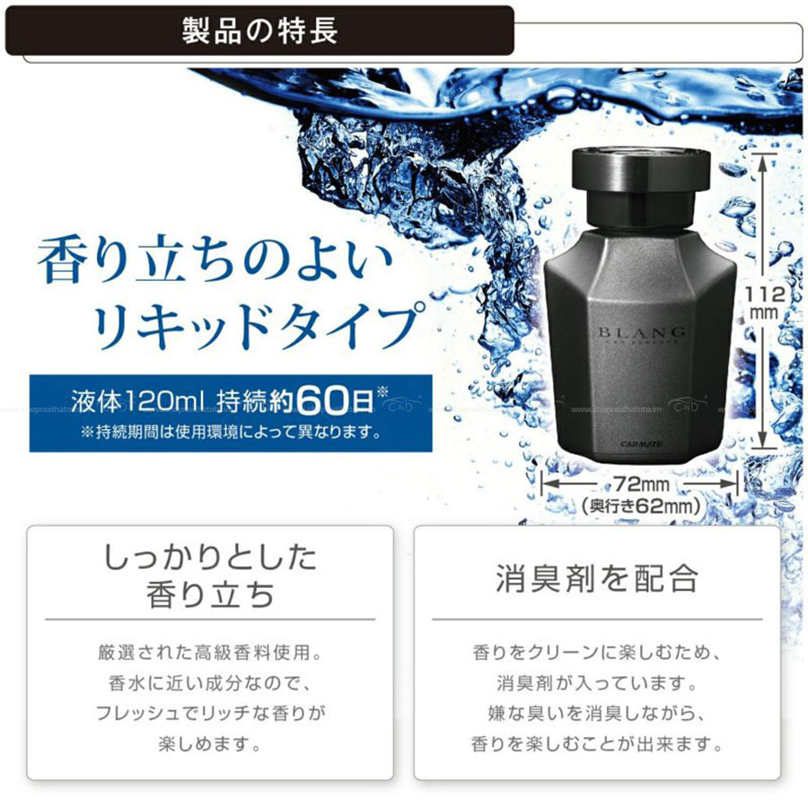 - Nước hoa ô tô CARMATE BLANG LIQUID MATTE ELEGANCE L862 Aberfitch 120ml giúp cải thiện không khí trong xe: khử sạch mùi hôi và nấm mốc trong xe một cách hiệu quả.