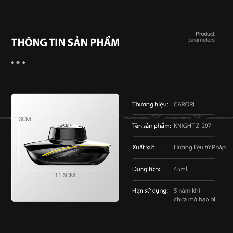 - Nước hoa ô tô CARORI KNIGHT Z-2971 Encounters 45ml được chế tạo bằng công thức đặc biệt với hương tự nhiên, dịu nhẹ và kiểu dáng sang trọng.
