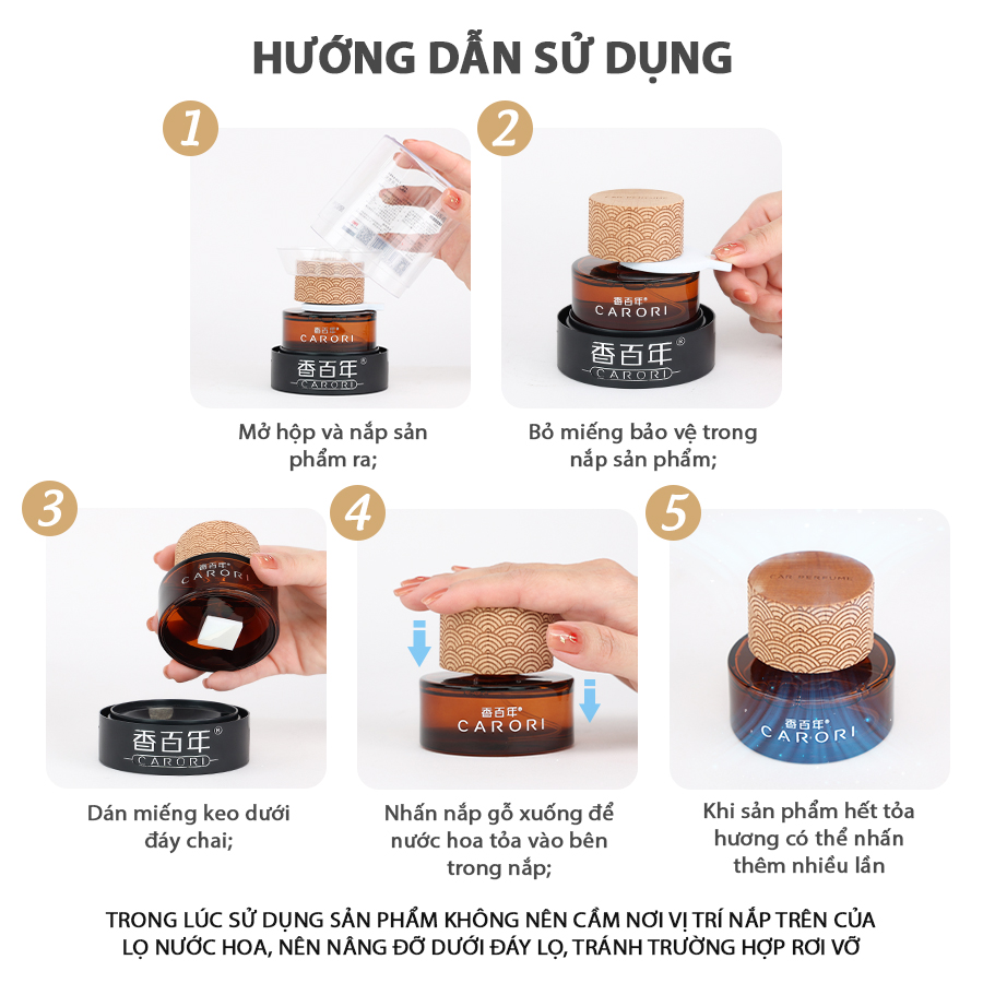 - Hướng dẫn sử dụng: Bỏ miếng bảo vệ trong nắp sản phẩm, nhấn nắp gỗ xuống để nước hoa tỏa vào bên trong nắp. Dán đế vào phần Taplo trên xe hoặc vị trí muốn đặt nước hoa. Khi sản phẩm hết tỏa hương có thể nhấn thêm nhiều lần.