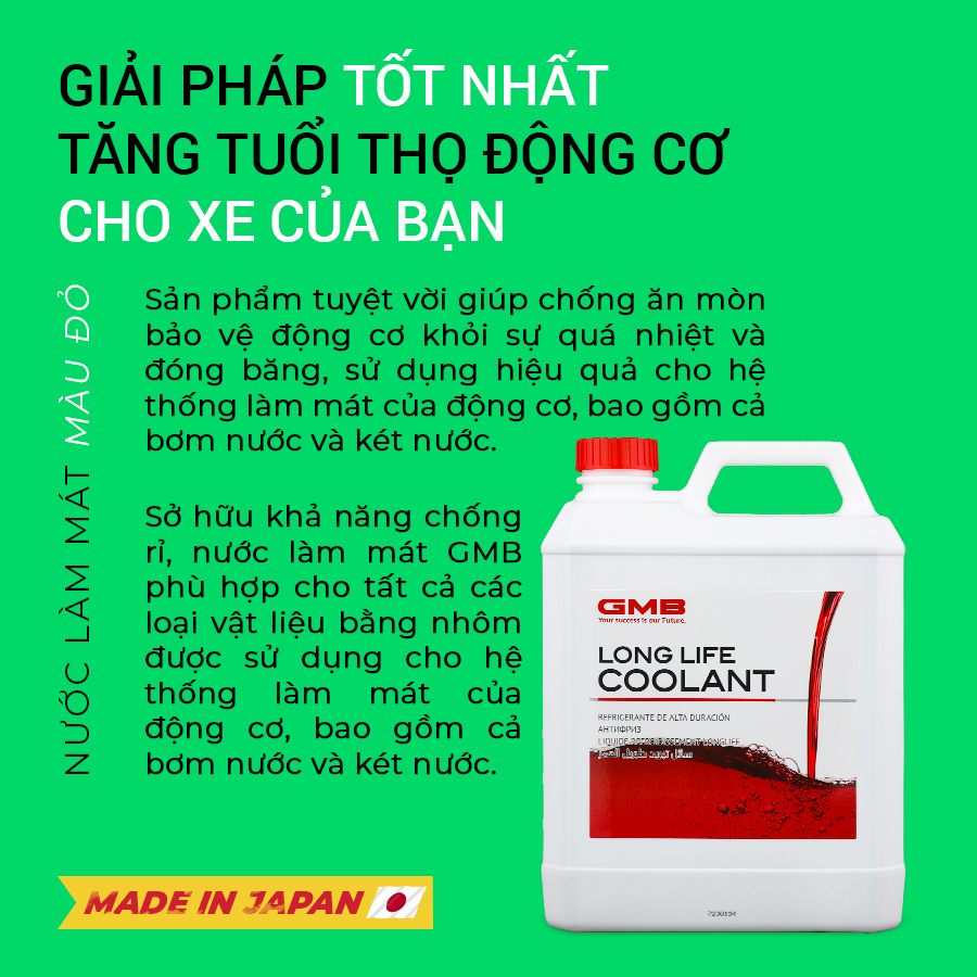 Nước Làm Mát Động Cơ Màu Đỏ GMB GLC-20-4.0-039 4L là sản phẩm được nghiên cứu để chống mòn, bảo vệ động cơ khỏi sự quá nhiệt và đóng băng, sử dụng hiệu quả cho hệ thống làm mát của động cơ, bao gồm cả bơm nước và két nước. Sản phẩm đã được kiểm chứng bởi các trung tâm hàng đầu, đảm bảo không những giúp bạn yên tâm hơn về chất lượng mà còn cả về độ an toàn khi sử dụng.