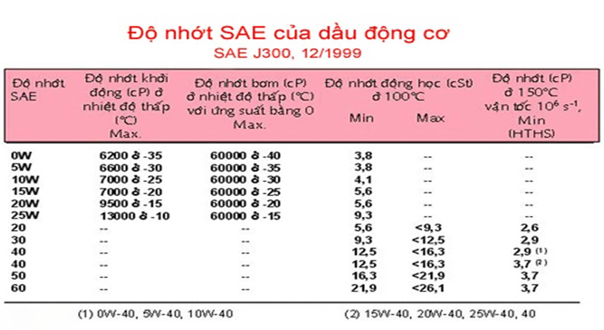 Trên thị trường hiện nay, các sản phẩm dầu nhớt đa cấp phổ biến thường có độ nhớt là SAE 5W40, 10W30, 10W40 và 20W50. Thông số này luôn được in trên sản phẩm để người dùng có thể dễ dàng nhận biết và lựa chọn loại nhớt phù hợp nhất.
