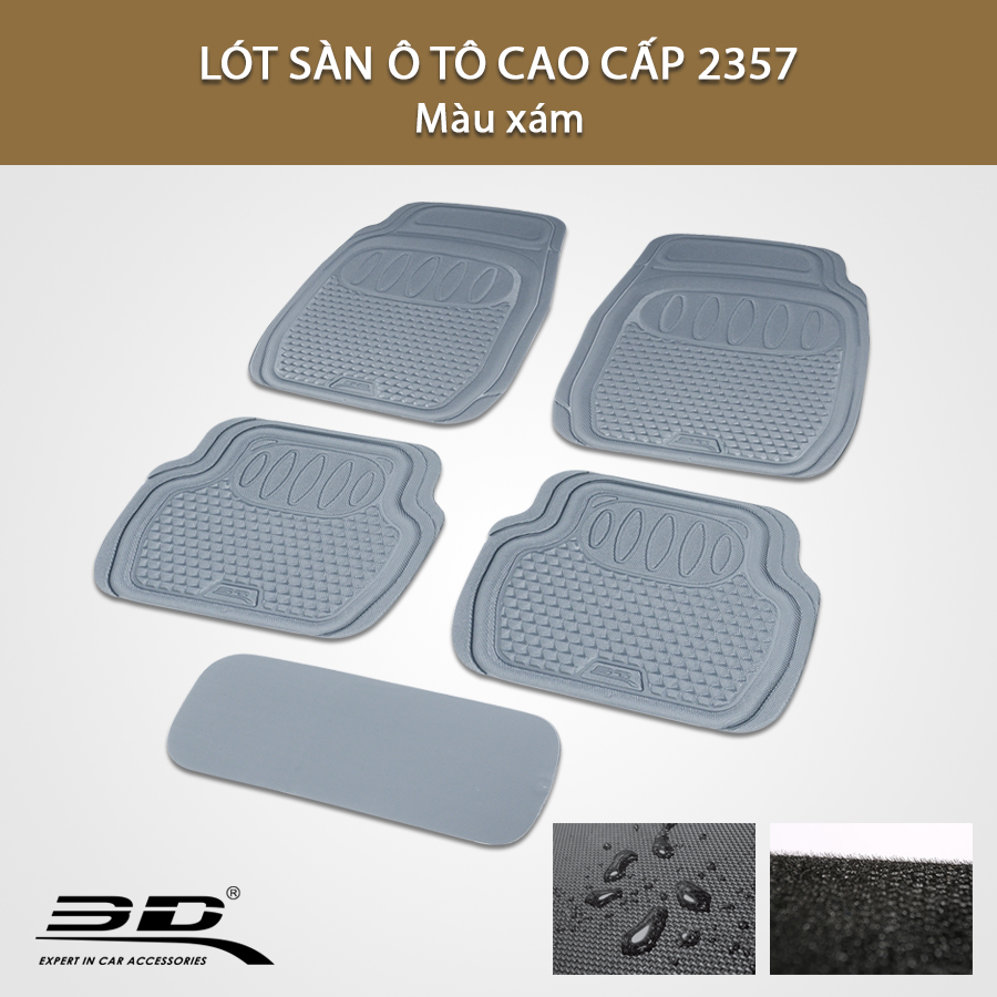 - Thảm lót sàn ô tô chống trượt 3D 2357 màu xám 4 chỗ là sản phẩm được chế tạo theo công nghệ tiên tiến, với cấu tạo hàng ngàn sợi Maxpider có khả năng hãm phanh chặt, ngăn chặn thảm trượt. Sản phẩm chịu được lực kéo 53kg, cùng khả năng chống thấm 100%, cách âm, giảm sốc, an toàn khi lái xe