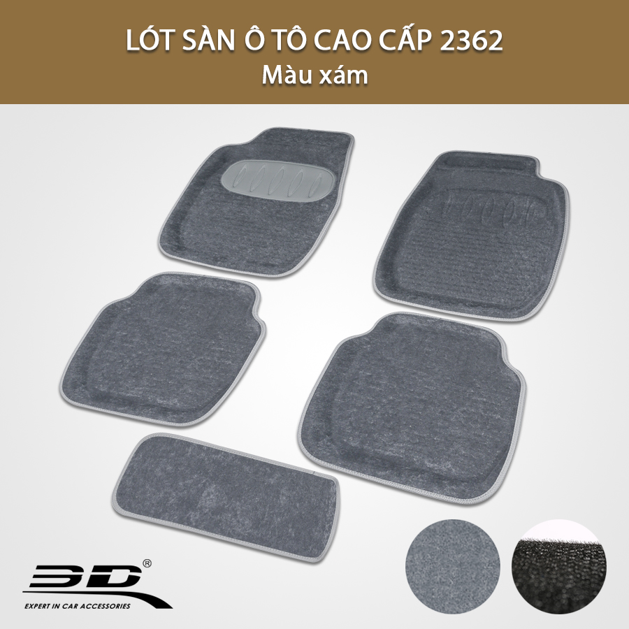- Thảm lót sàn ô tô chống trượt 3D 2362 màu xám 4 chỗ là sản phẩm được chế tạo theo công nghệ tiên tiến, với cấu tạo hàng ngàn sợi Maxpider có khả năng hãm phanh chặt, ngăn chặn thảm trượt. Sản phẩm chịu được lực kéo 53kg, cùng khả năng chống thấm 100%, cách âm, giảm sốc, an toàn khi lái xe