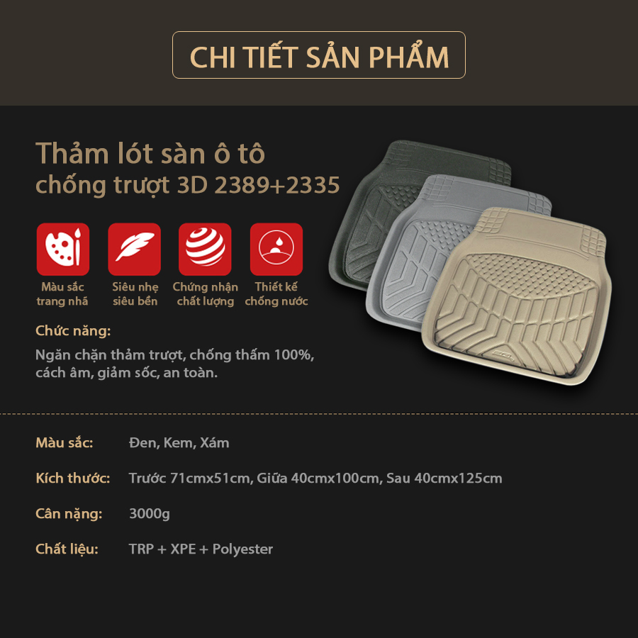 - Cam kết cung cấp Thảm lót sàn ô tô chống trượt 3D 2389- 2335 size M- 2335 size L màu đen 7 chỗ chính hãng 100%.