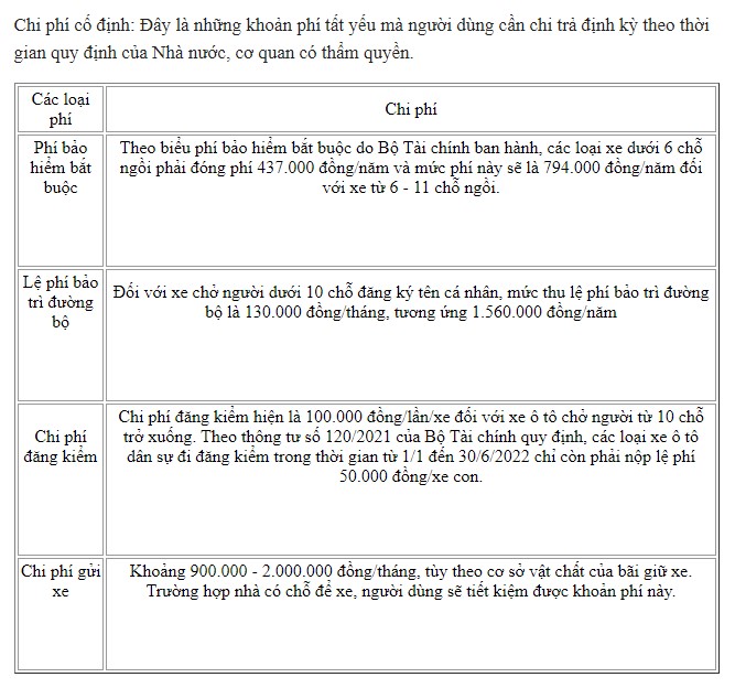 Về cơ bản, các loại phí “nuôi” xe được chia ra 2 nhóm chính, gồm chi phí sử dụng cố định và chi phí sử dụng không cố định.