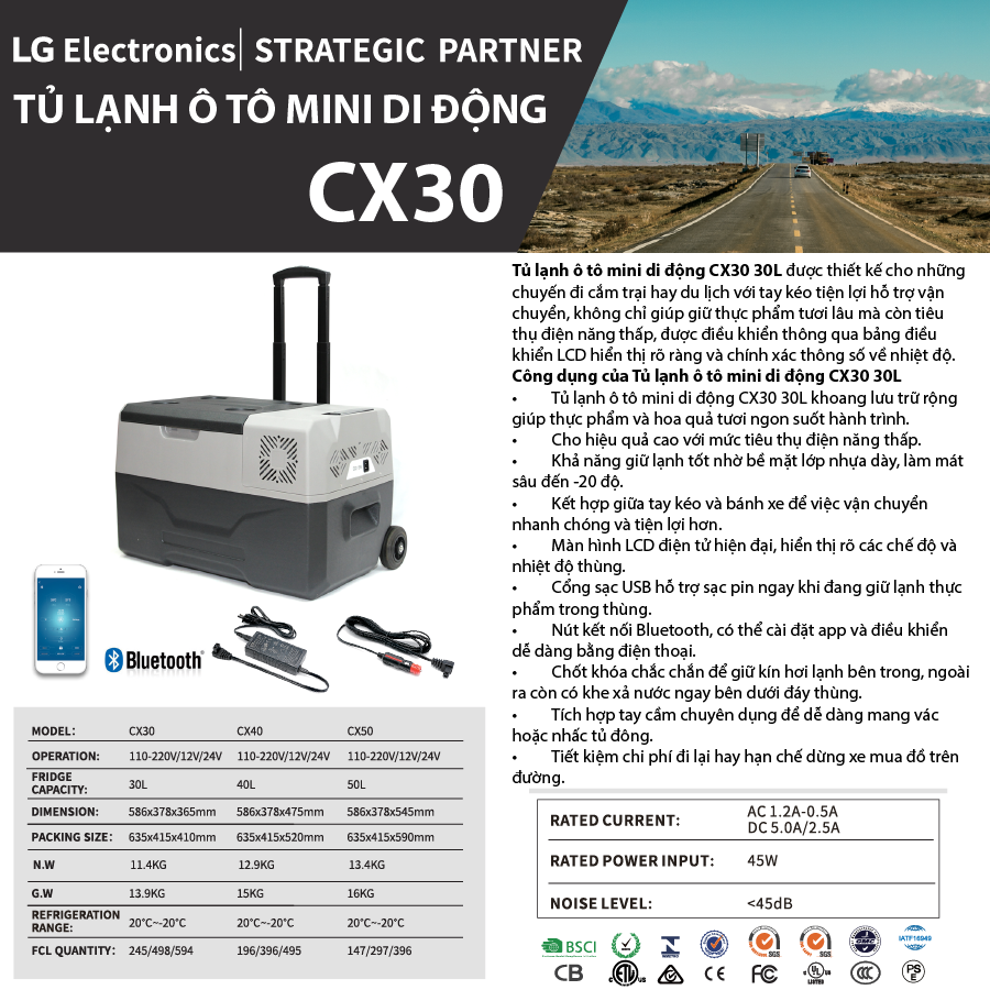 - Tủ lạnh ô tô mini di động CX30 30L với thiết kế chuyên dụng cho những chuyến đi xa, sử dụng bảng điều khiển điện tử giúp điều chỉnh nhiệt độ như một tủ đông hiện đại, giúp bạn lưu trữ tươi ngon những thực phẩm trong suốt cuộc hành trình ngoài ra còn giúp tiết kiệm chi phí khi sở hữu khả năng tiêu thụ điện thấp.