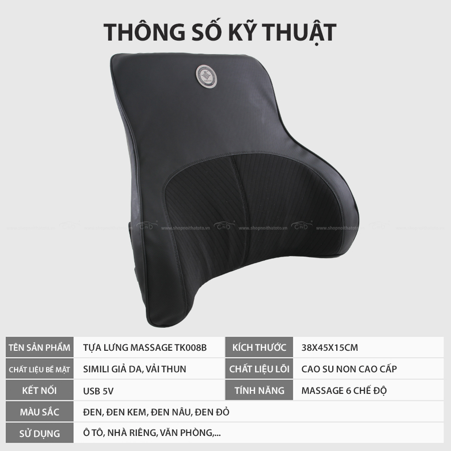 - Tựa lưng massage TK008B màu đen đỏ với chất liệu cao cấp, ruột bên trong được làm từ cao su thiên nhiên, mang đến cảm giác mềm mại, cực thoải mái cho người sử dụng. Đặc biệt sản phẩm có độ đàn hồi tốt, tự khôi phục hình dạng sau khi dùng, áo tựa lưng có thể mở ra để giặt dễ dàng nên rất tiện ích. Bên cạnh đó, sản phẩm 6 chế độ Massage và tính năng hẹn giờ hiện đại.
